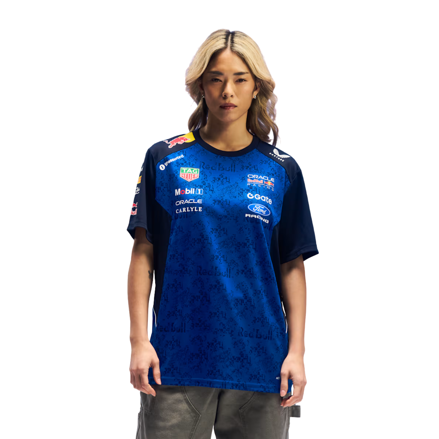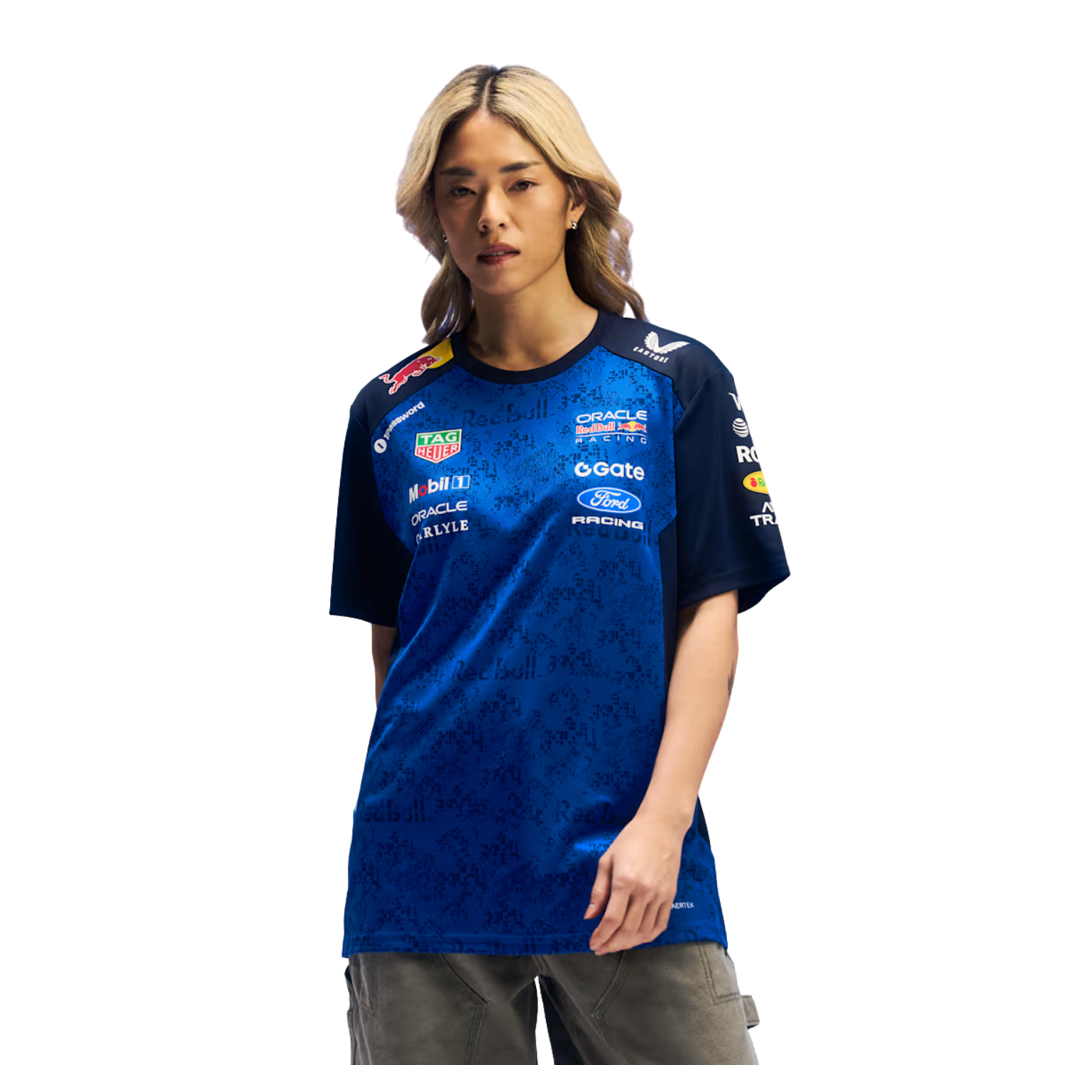Enjoy the season in comfort in this elegant REPLICA T-shirt for women. The AerTek material will ensure that you stay cool and dry. Authentic track look, with Oracle Red Bull Racing and partner logos and a new color and print to keep you stylishly equipped for every race.
