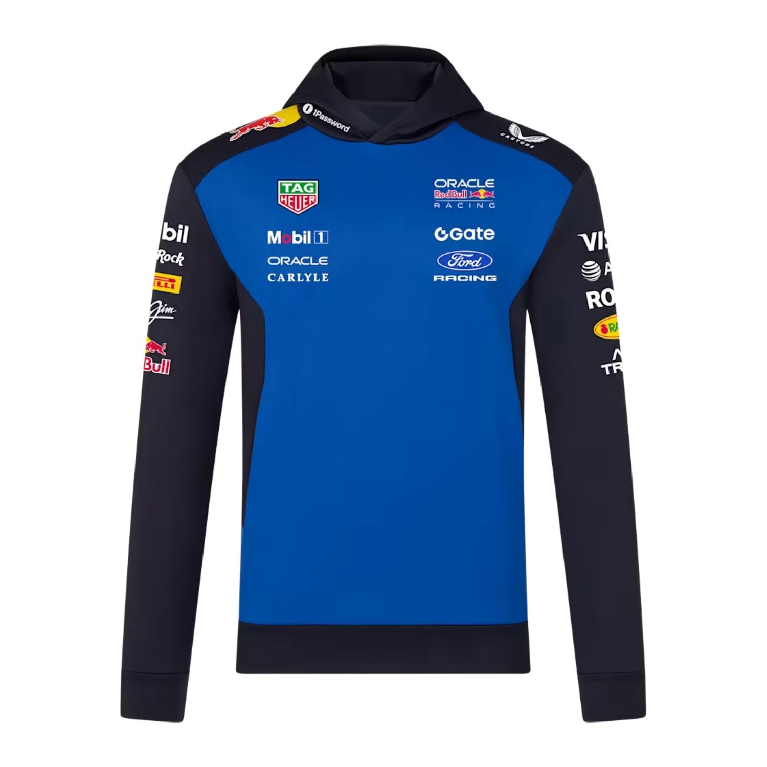 - Oracle Red Bull Racing, Castore és partnerlogók a mellkason, a háton és az ujjakon