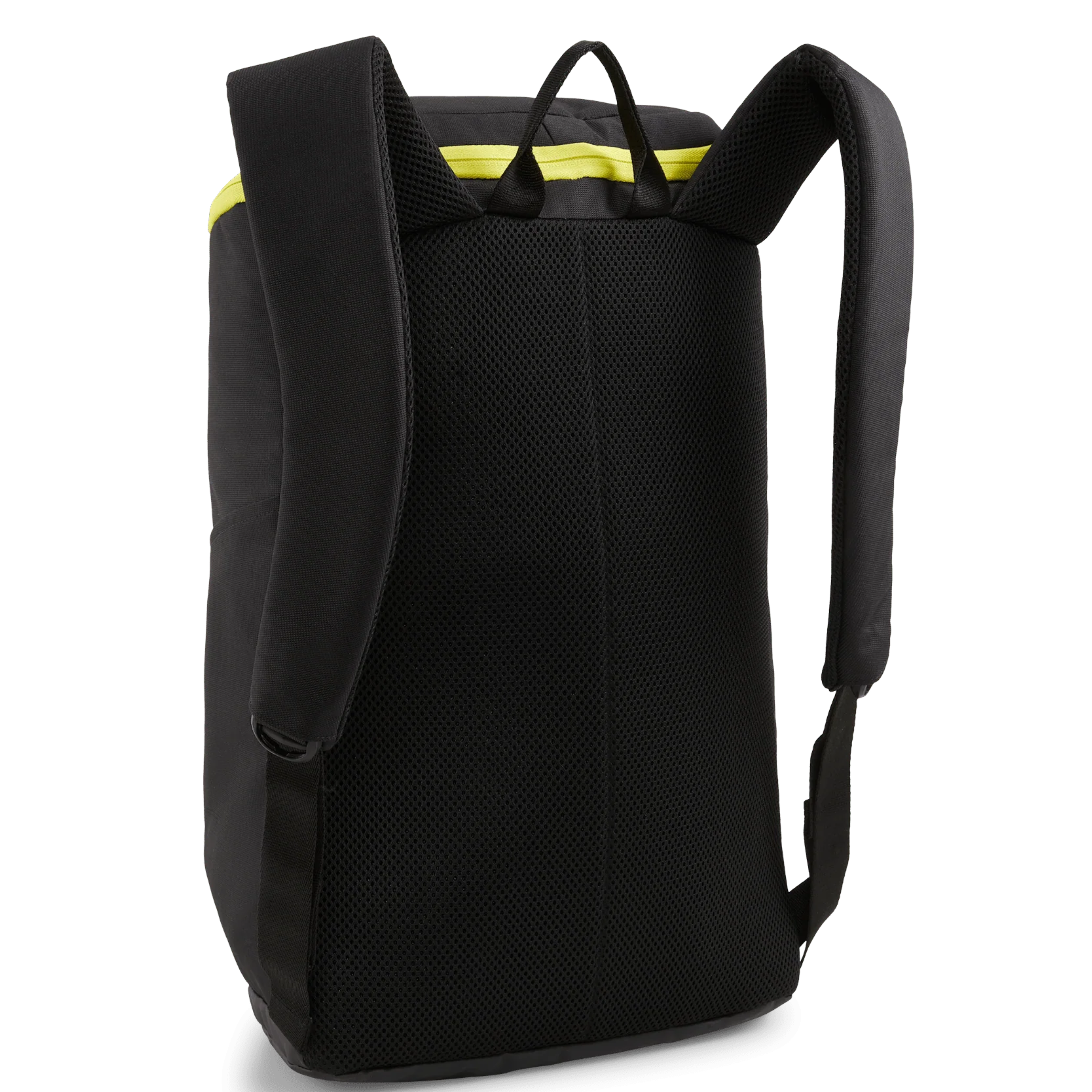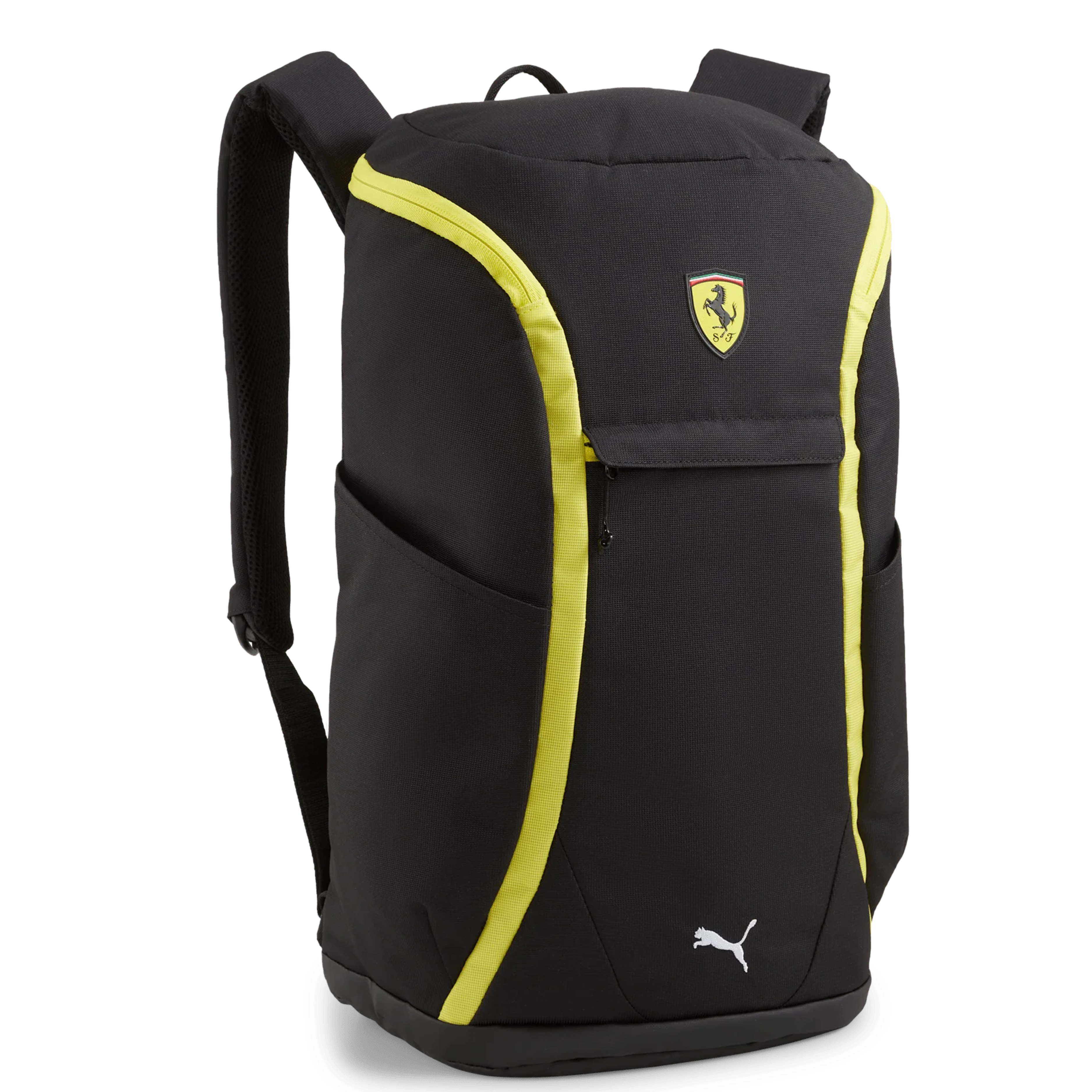 Scuderia Ferrari Backpack Black Yellow. Official PUMA Scuderia Ferrari Team Backpack with adjustable padded shoulder straps, back padding and multiple zipped compartments. Yellow accents complement the sleek black design with a precisely printed Scuderia Ferrari logo to complete the look.