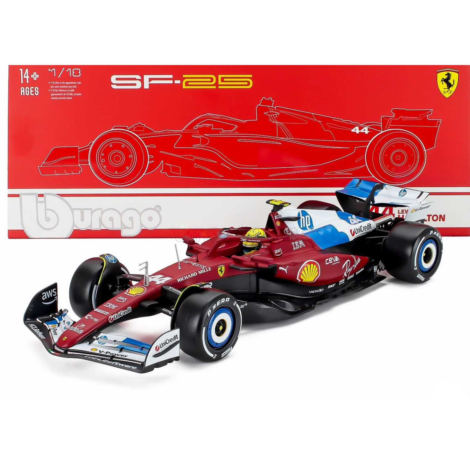 Modell des Herstellers Bburago Scuderia Ferrari SF-25 in einer Sonderlackierung für den Großen Preis von Miami 2025 mit Fahrer Lewis Hamilton.