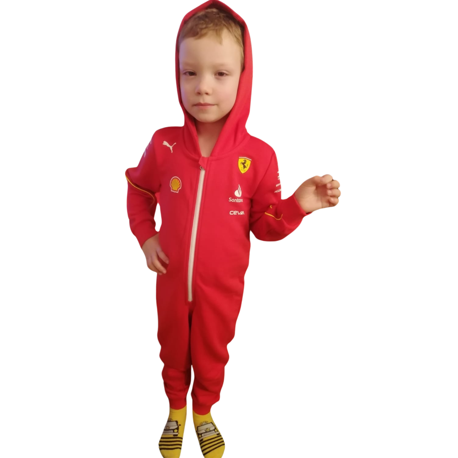 Kids' Scuderia Ferrari hooded tracksuit. Zip-up front and team and sponsor logos. With the official Kids' PUMA 2024 Scuderia Ferrari Team Onesie, aspiring fans can stay warm and cozy while looking like their favorite team driver. The Kids Onesie features yellow piping and details inspired by all of the team's racing suits along with all of the official team and sponsor branding.