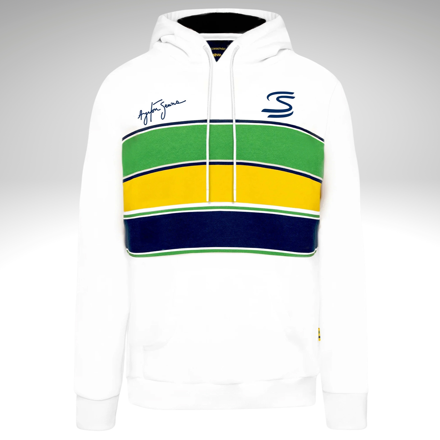 The Ayrton Senna Stripe hoodie in white is inspired by the legendary helmet design of the Brazilian Formula 1 champion. Thanks to the bright colors and distinctive style, it is an exceptional piece for every motorsport enthusiast. Material 80% cotton, 20% polyester.
