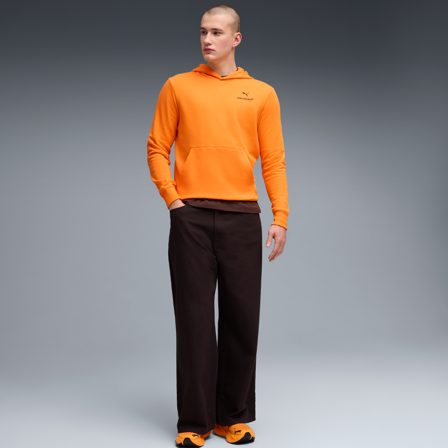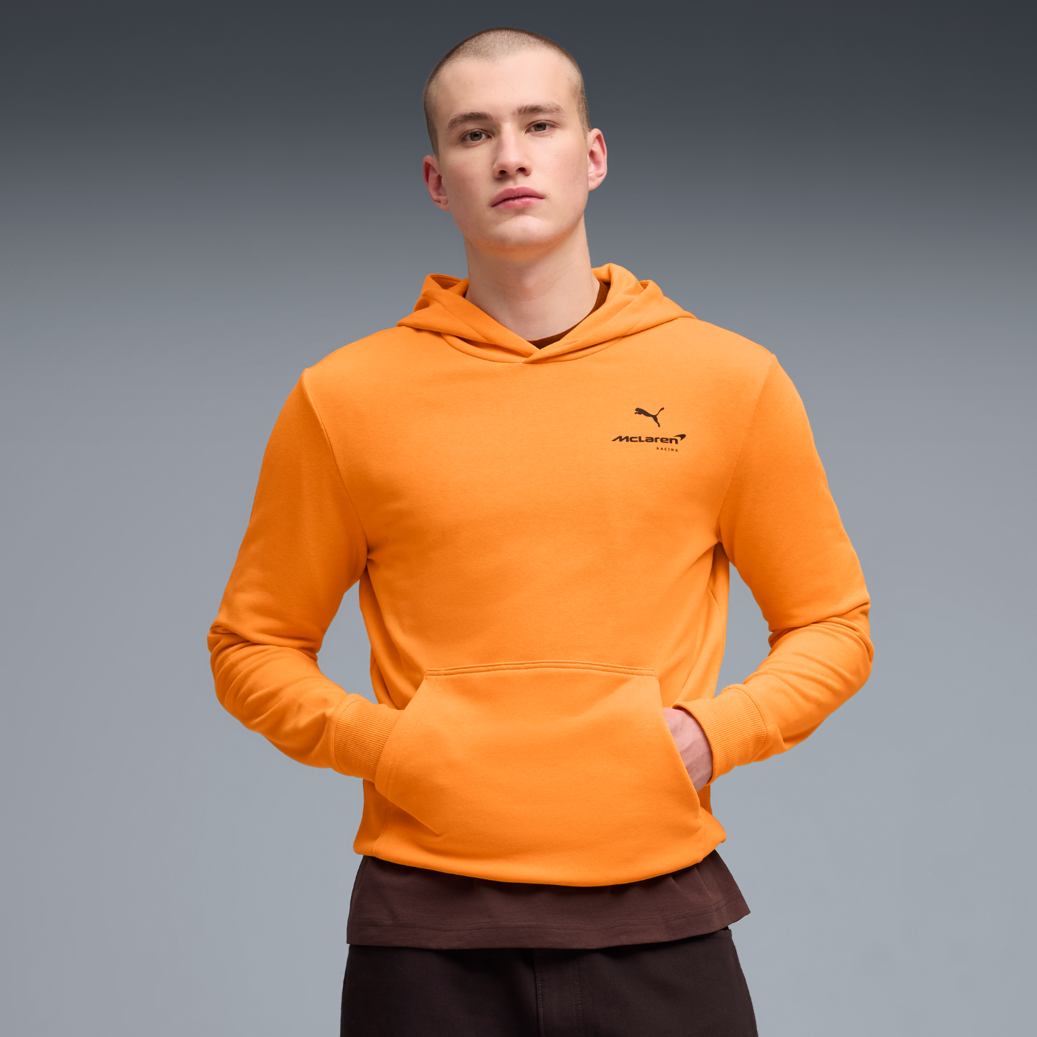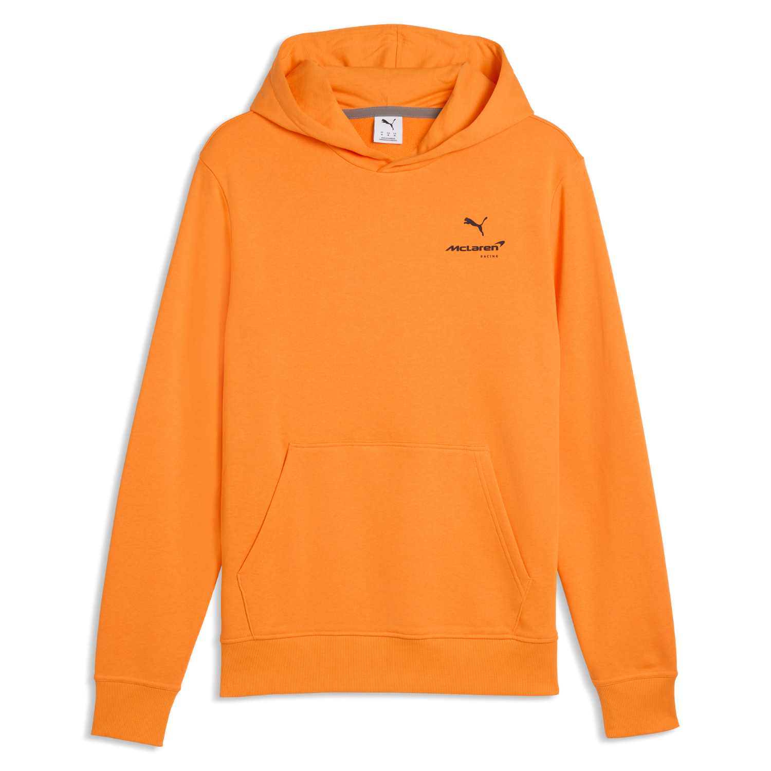 McLaren Essentials hoodie in orange. McLaren team logo and Puma logo on the hoodie, pockets on the front.