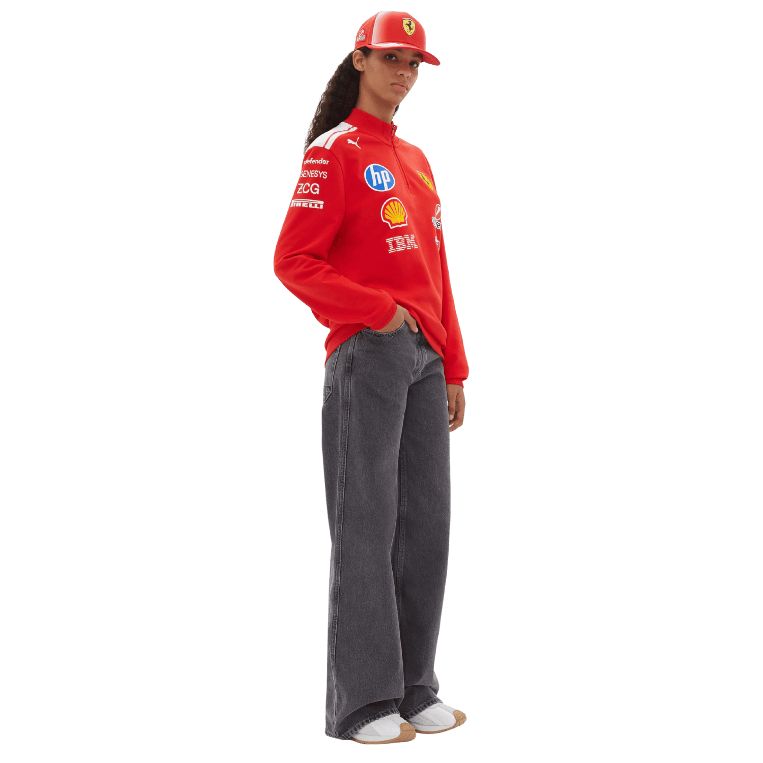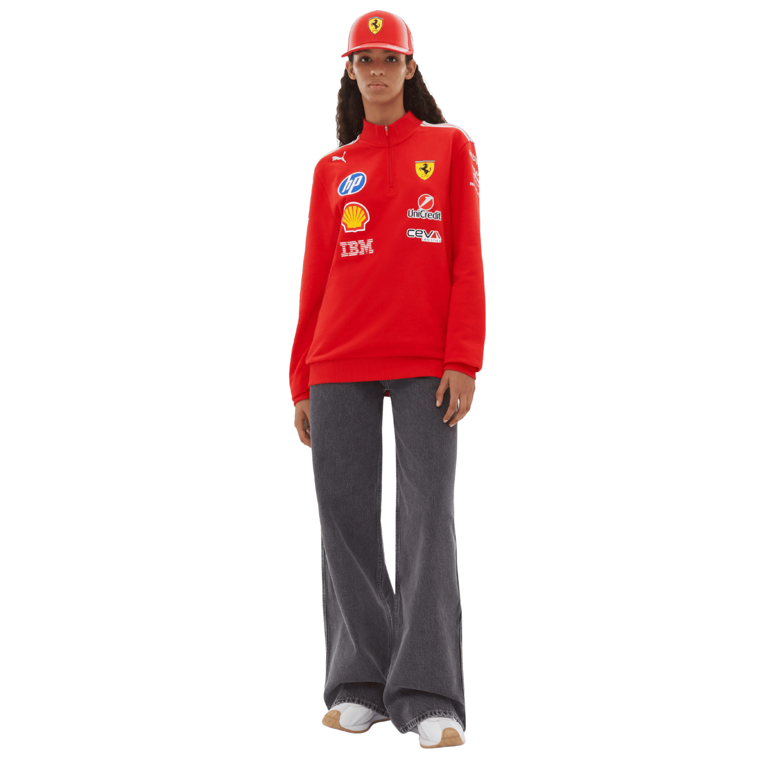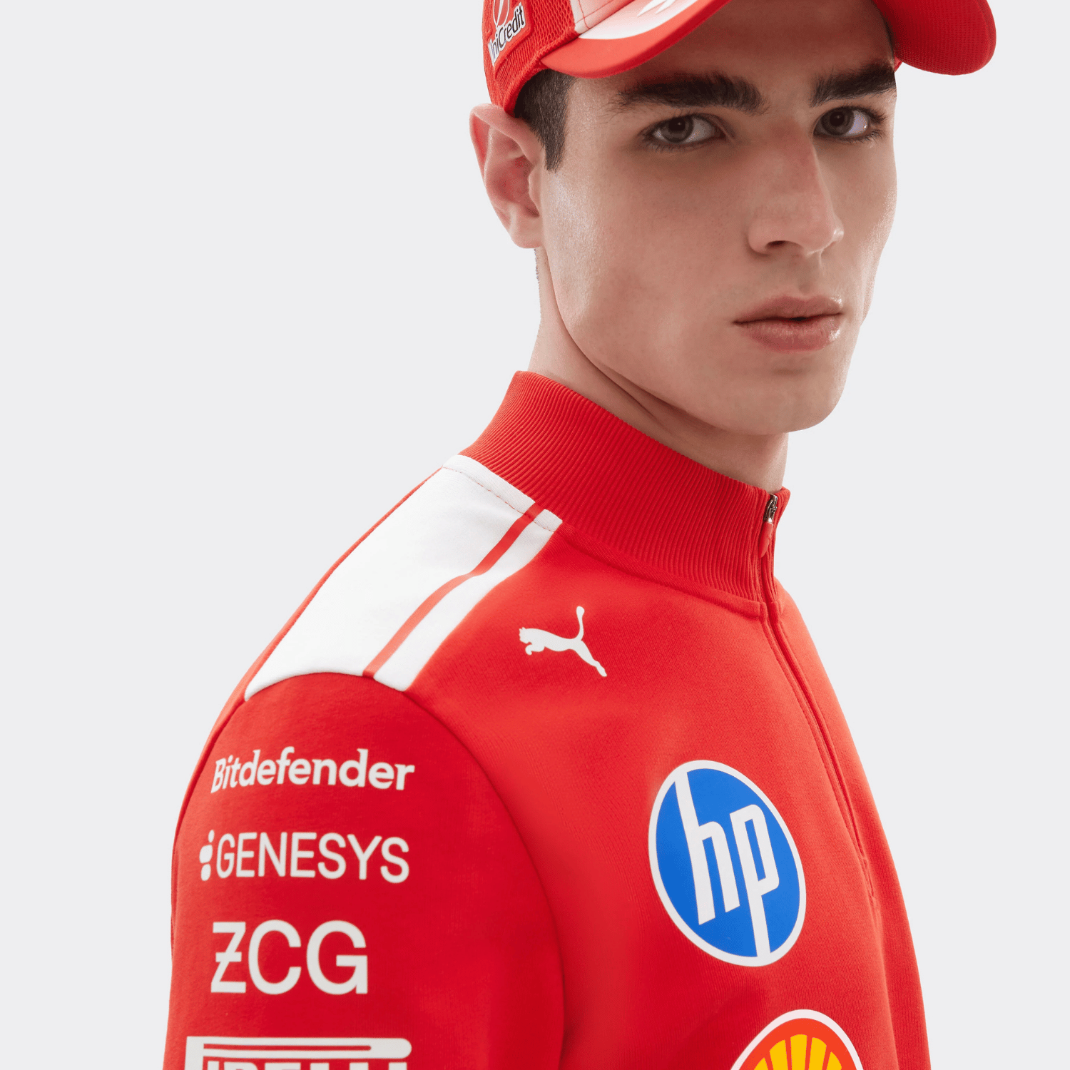 The PUMA sweatshirt from the Replica collection for Scuderia Ferrari HP is based on the style of clothing worn by the Ferrari team during the 2026 Formula 1 season. It has a high collar with a half-zip, which gives it a modern and functional look suitable for everyday wear.