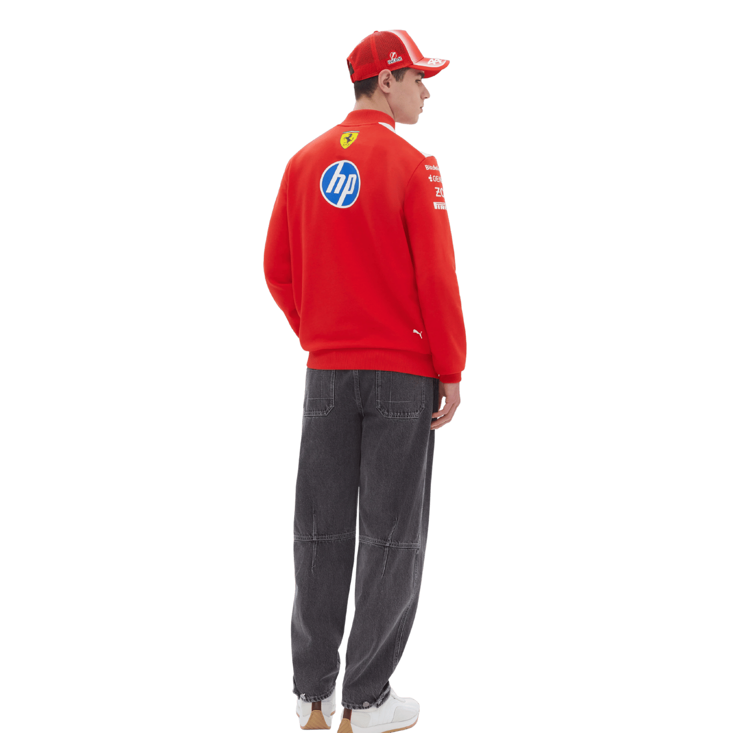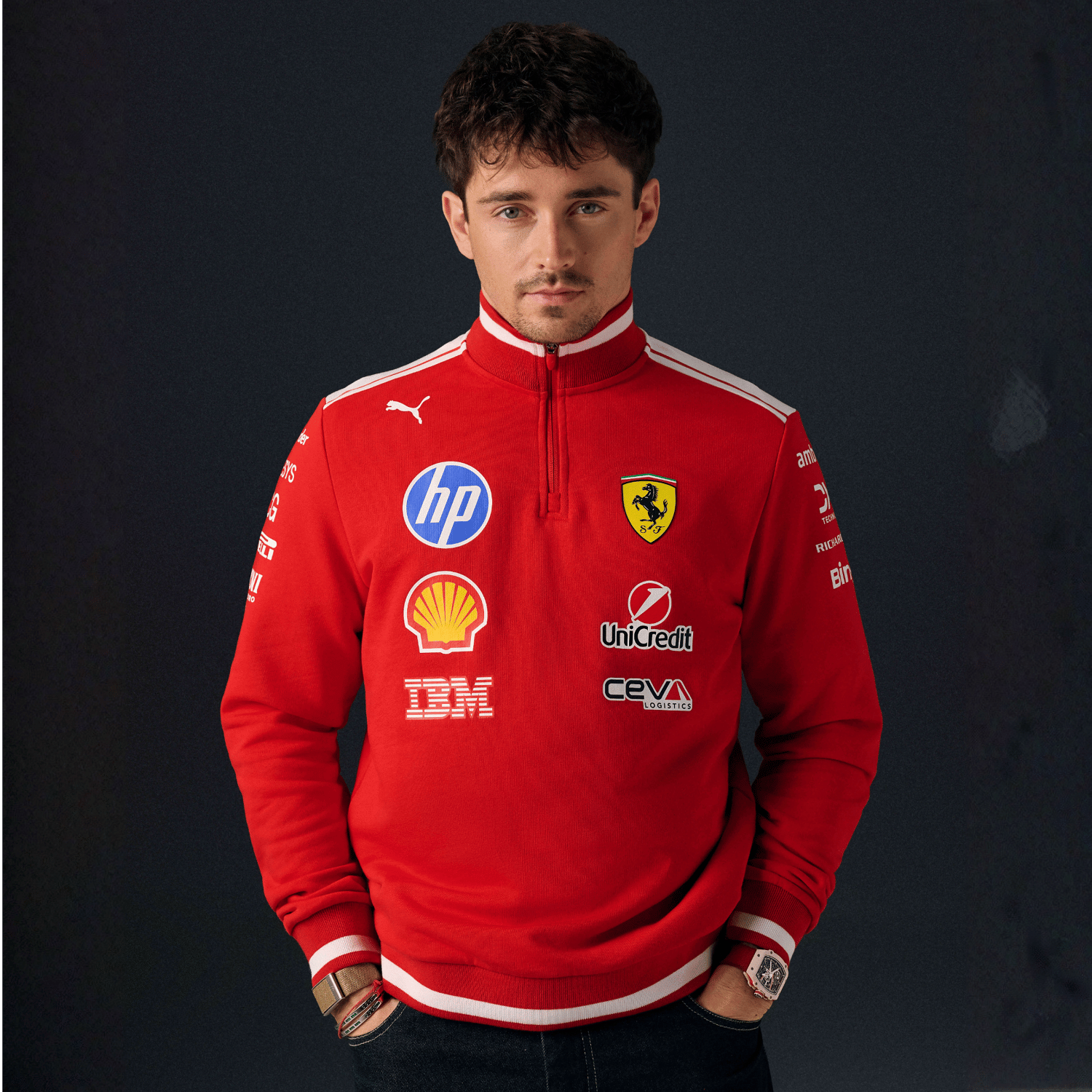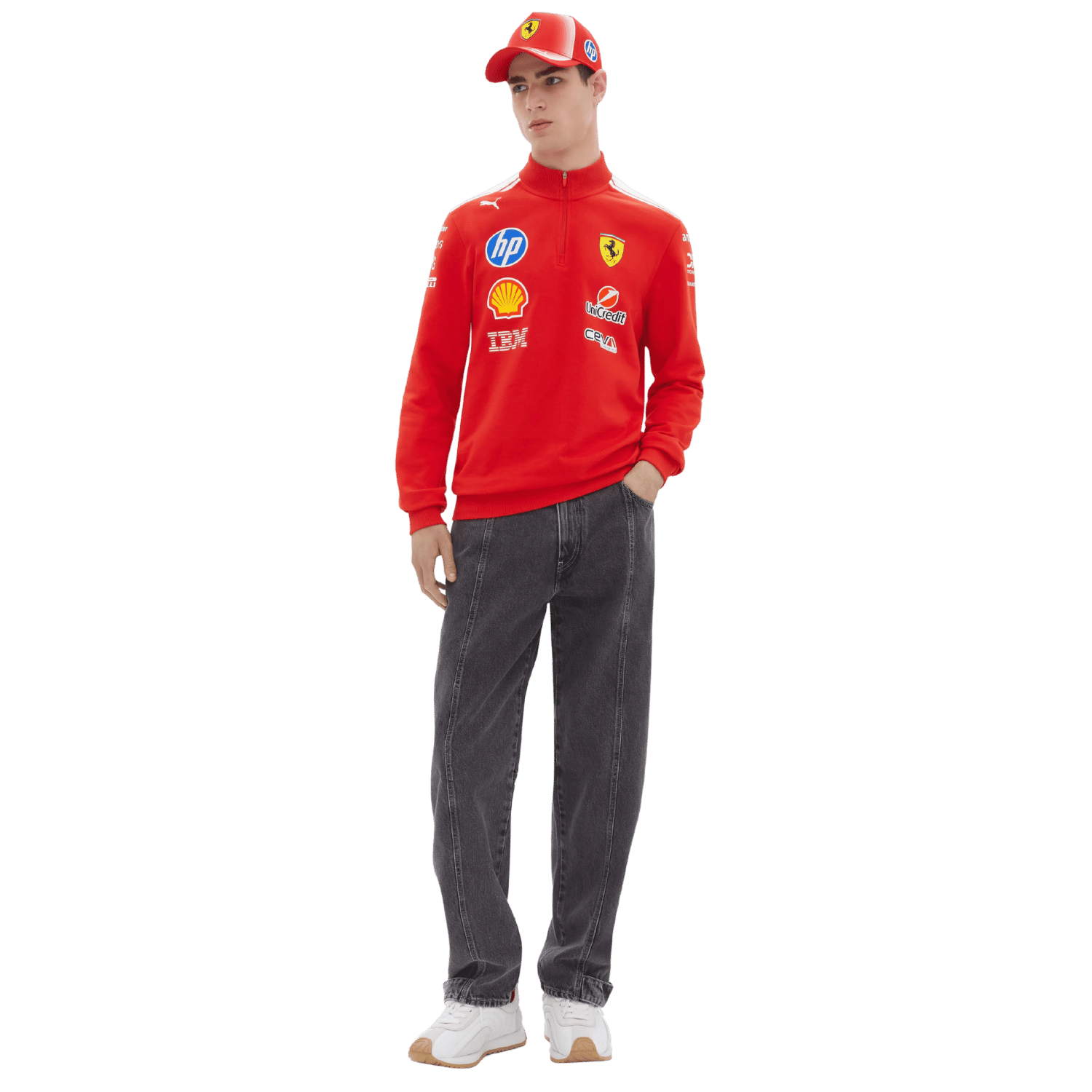 The PUMA sweatshirt from the Replica collection for Scuderia Ferrari HP is based on the style of clothing worn by the Ferrari team during the 2026 Formula 1 season. It has a high collar with a half-zip, which gives it a modern and functional look suitable for everyday wear.