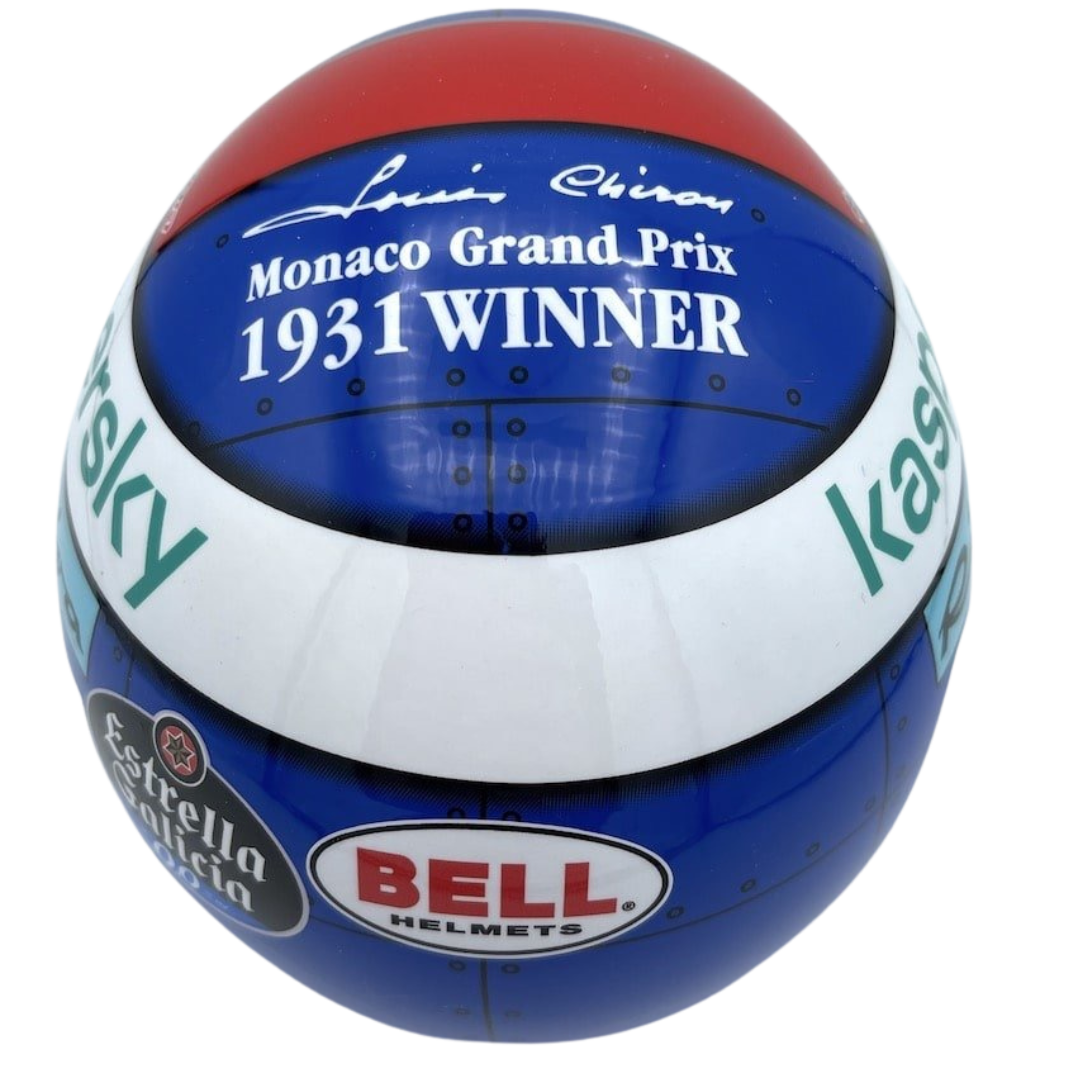 Mini helmet of Monegasque driver Charles Leclerc used at the 2021 Monaco GP. Scale 1:2. This mini helmet has a special design that the Scuderia Ferrari driver wanted to use at the Monaco GP as a tribute to Monegasque driver Louis Chiron. Louis Chiron was one of the greatest drivers between the two world wars, with a career spanning over thirty years, he is the driver who competed in Formula 1 at the oldest age with a sixth place at the 1955 Monaco GP at the age of 55. The Bugatti Chiron supercar is named after him as a tribute. In 1931, he won the Monaco Grand Prix for Bugatti from 11th on the grid. To this day, he is the only Monegasque to have won his home race. Unfortunately, this beautiful mini-helmet could not be seen in the race because Charles Leclerc, who took pole position, suffered an accident in the final qualifying lap, which prevented him from repairing his Ferrari in time to take part in the race. Limited edition.