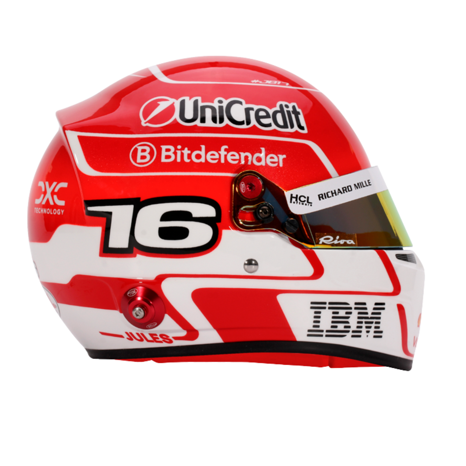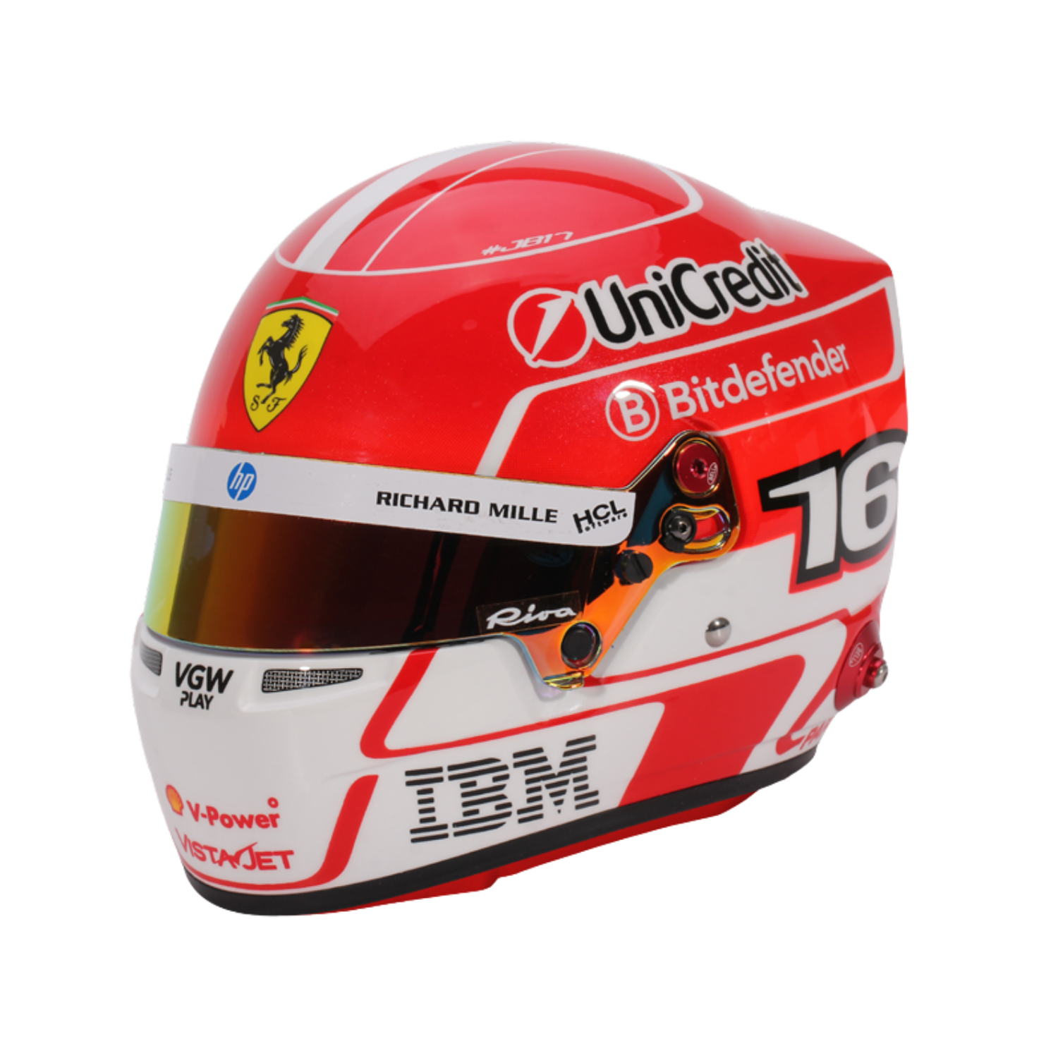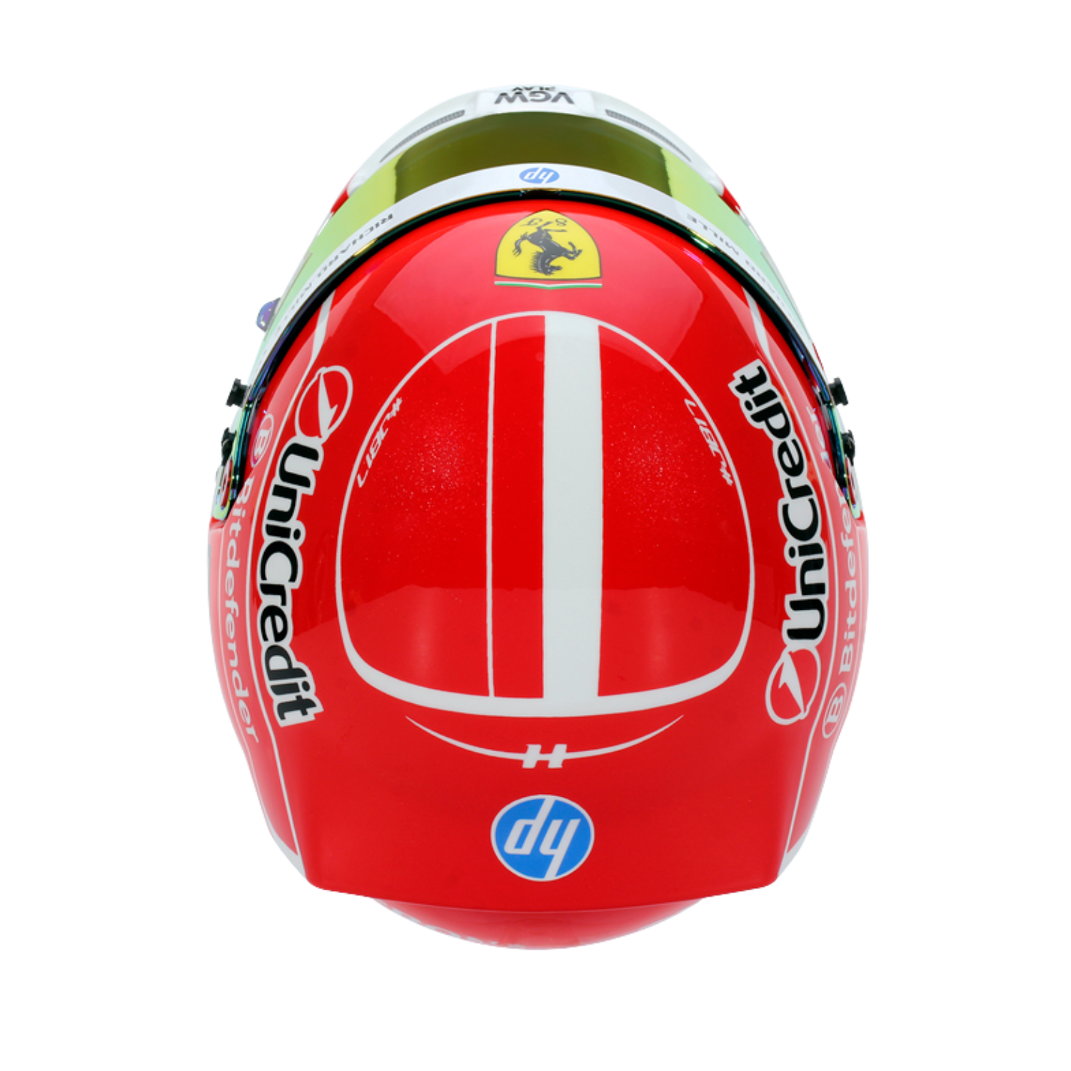 Pre sezónu F1 2025 – jeho siedmu s tímom Scuderia Ferrari HP – Charles Leclerc vyvinul dizajn svojej prilby s výraznou dvojdielnou schémou. Horná polovica je v ikonickej červenej farbe tímu, zatiaľ čo biely nádych v spodnej časti predstavuje jeho domovskú krajinu. Verný tradícii, na vrchu zostáva monacká vlajka a po stranách sa nachádza jeho pretekárske číslo – pocta jeho koreňom a hrdosti na to, že je súčasťou tímu Prancing Horse.