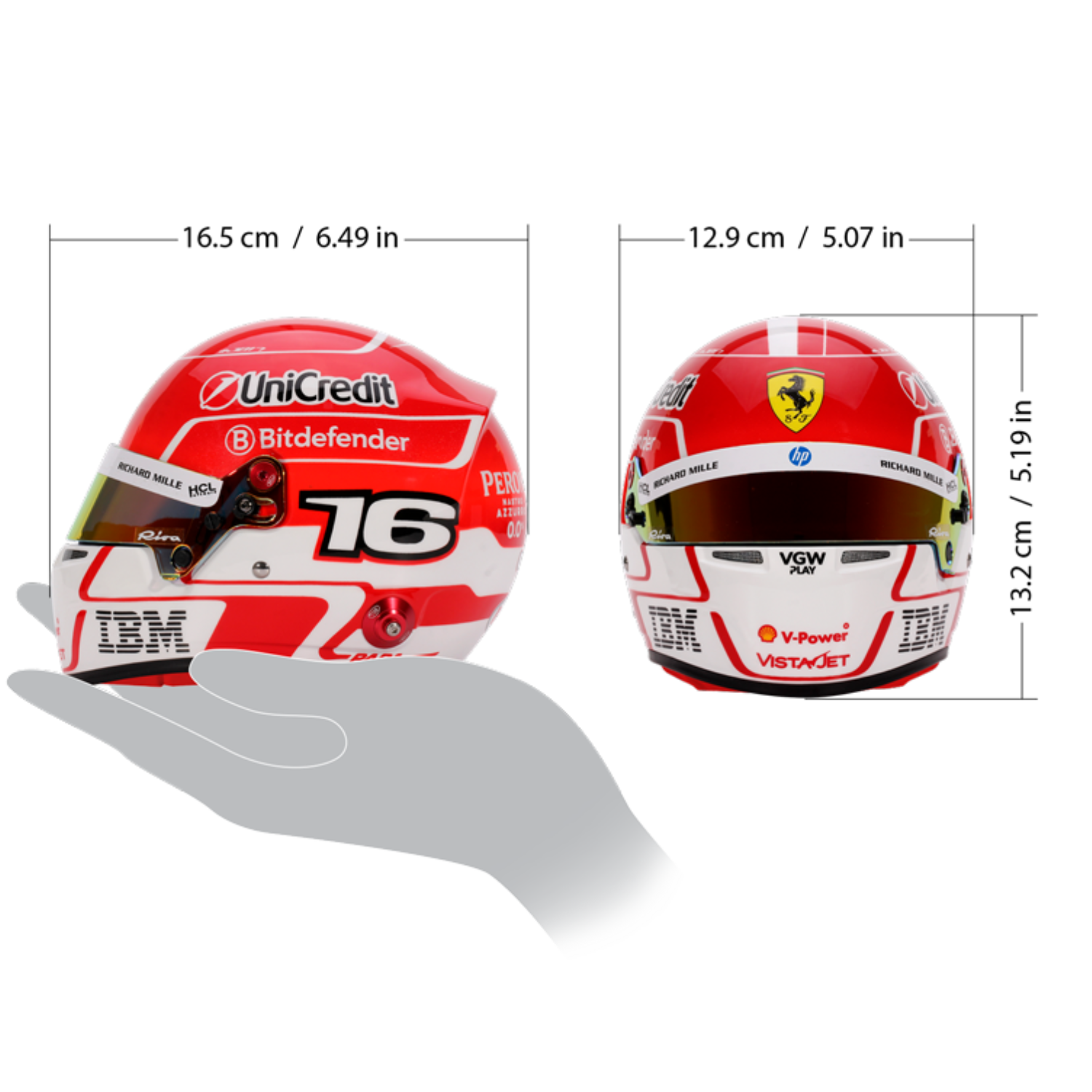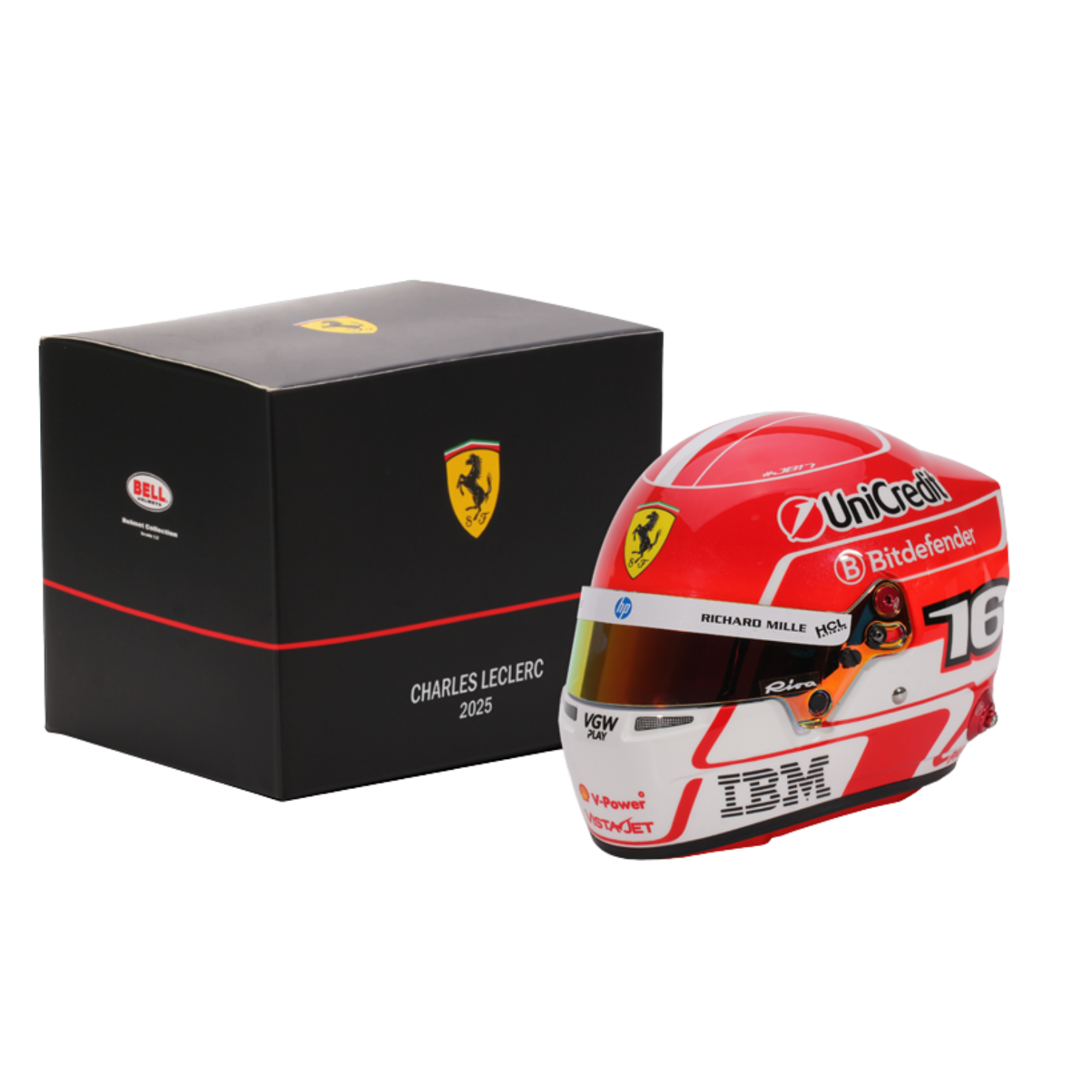 Scuderia Ferrari driver Charles Leclerc's 2025 mini helmet in 1:2 scale, manufactured by Bell helmets.