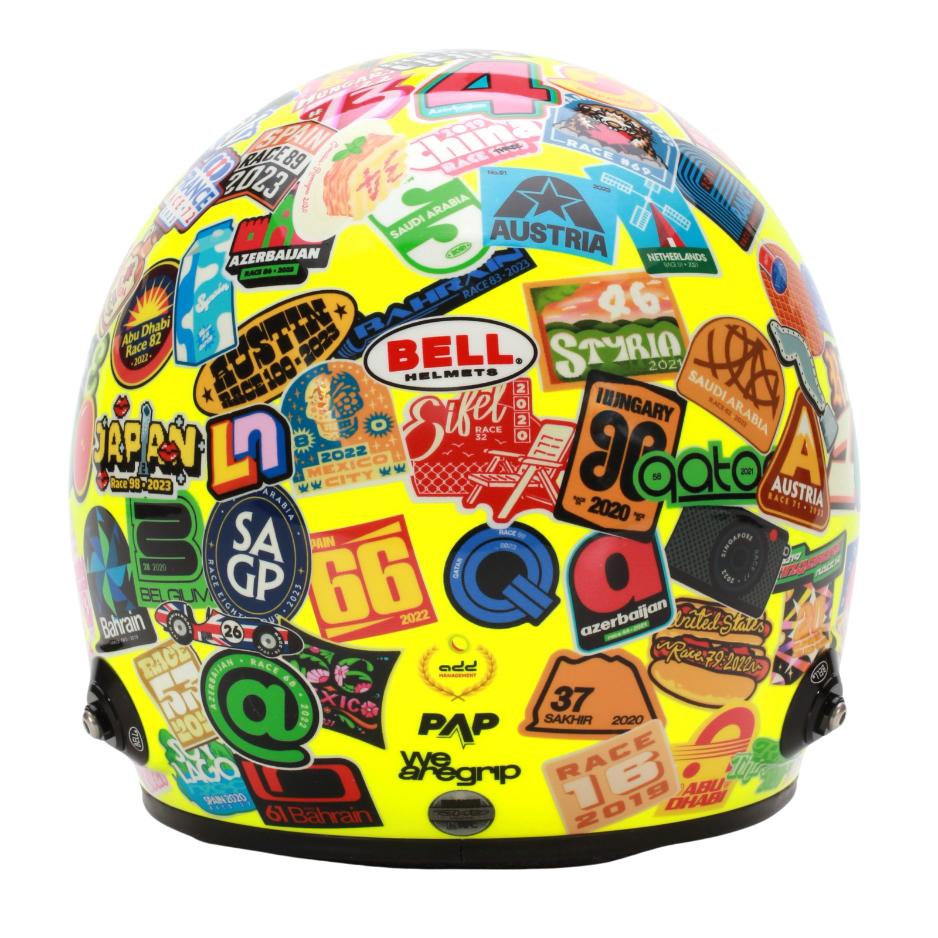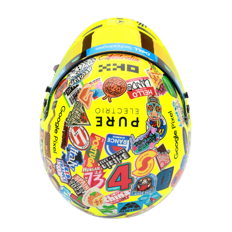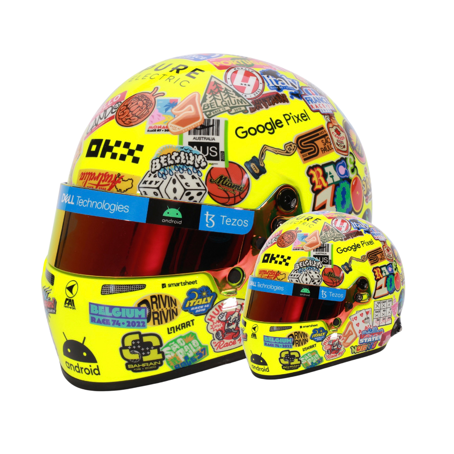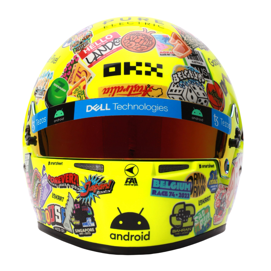 Mini Helmet of McLaren driver Lando Norris and his design at his 100th grand prix, it was the 2023 US Grand Prix Austin. Scale 1:2. Manufacturer Bell Helmets.
