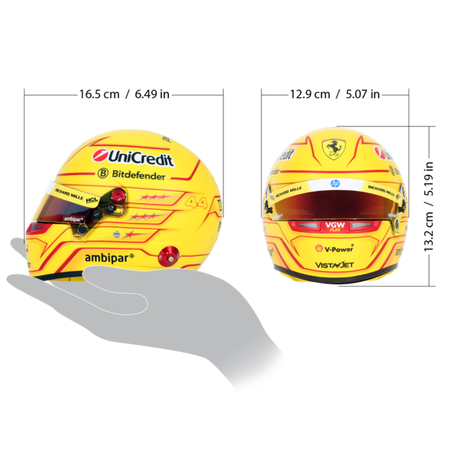 ACHTUNG VORBESTELLUNG. Mini-Helm des Scuderia Ferrari-Teamfahrers Lewis Hamilton im Maßstab 1:2, hergestellt von Bell Helmets. Voraussichtliche Verfügbarkeit November - Dezember 2025
