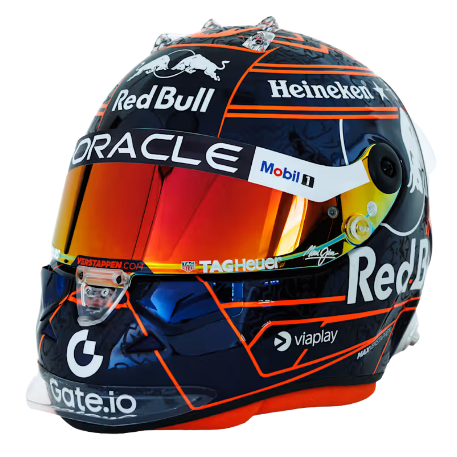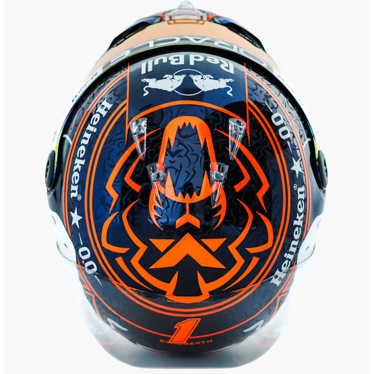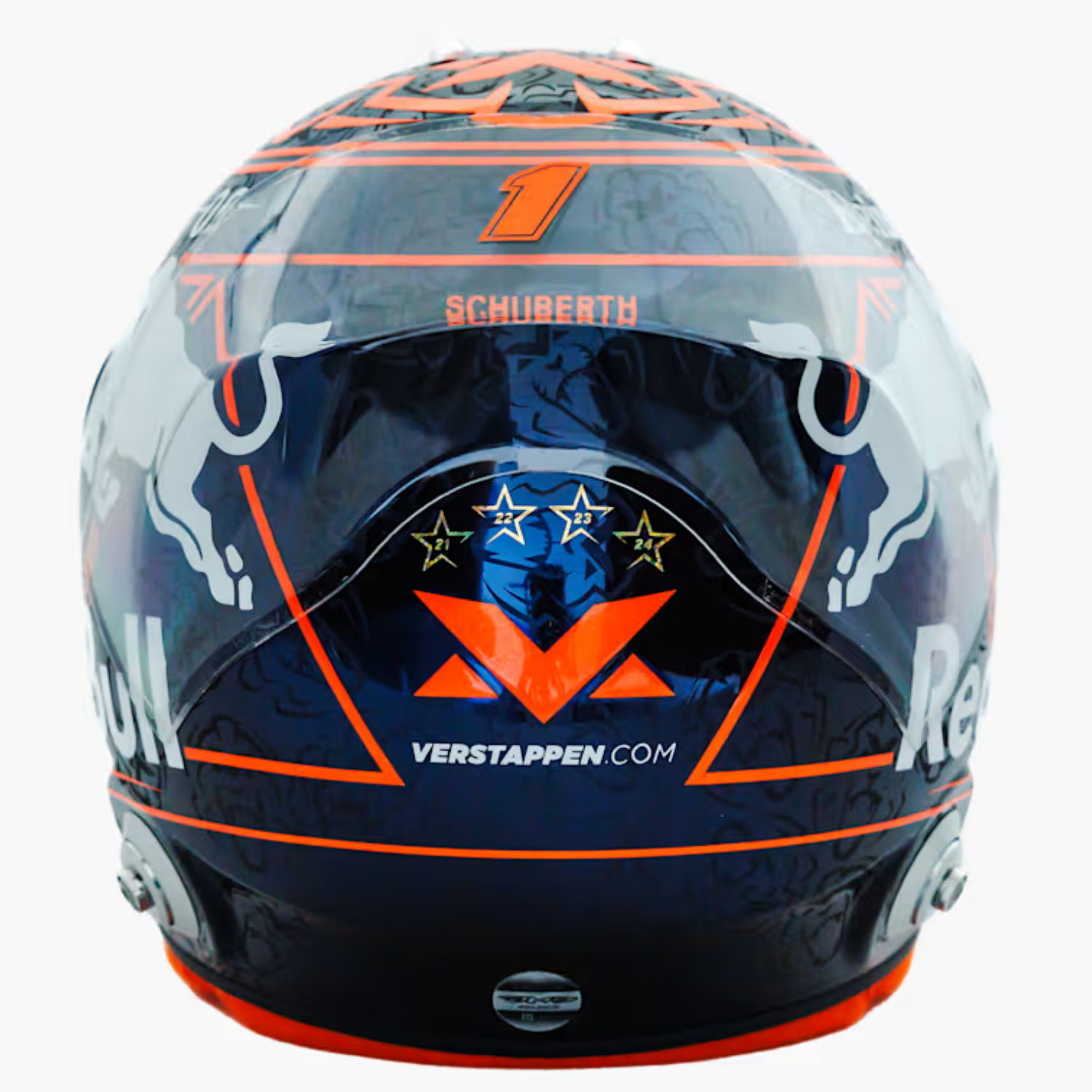Mini helmet Max Verstappen orange in 1:2 scale. The design of this helmet was used at the Austrian, Dutch and Belgian Grand Prix in 2025. Limited quantity available.