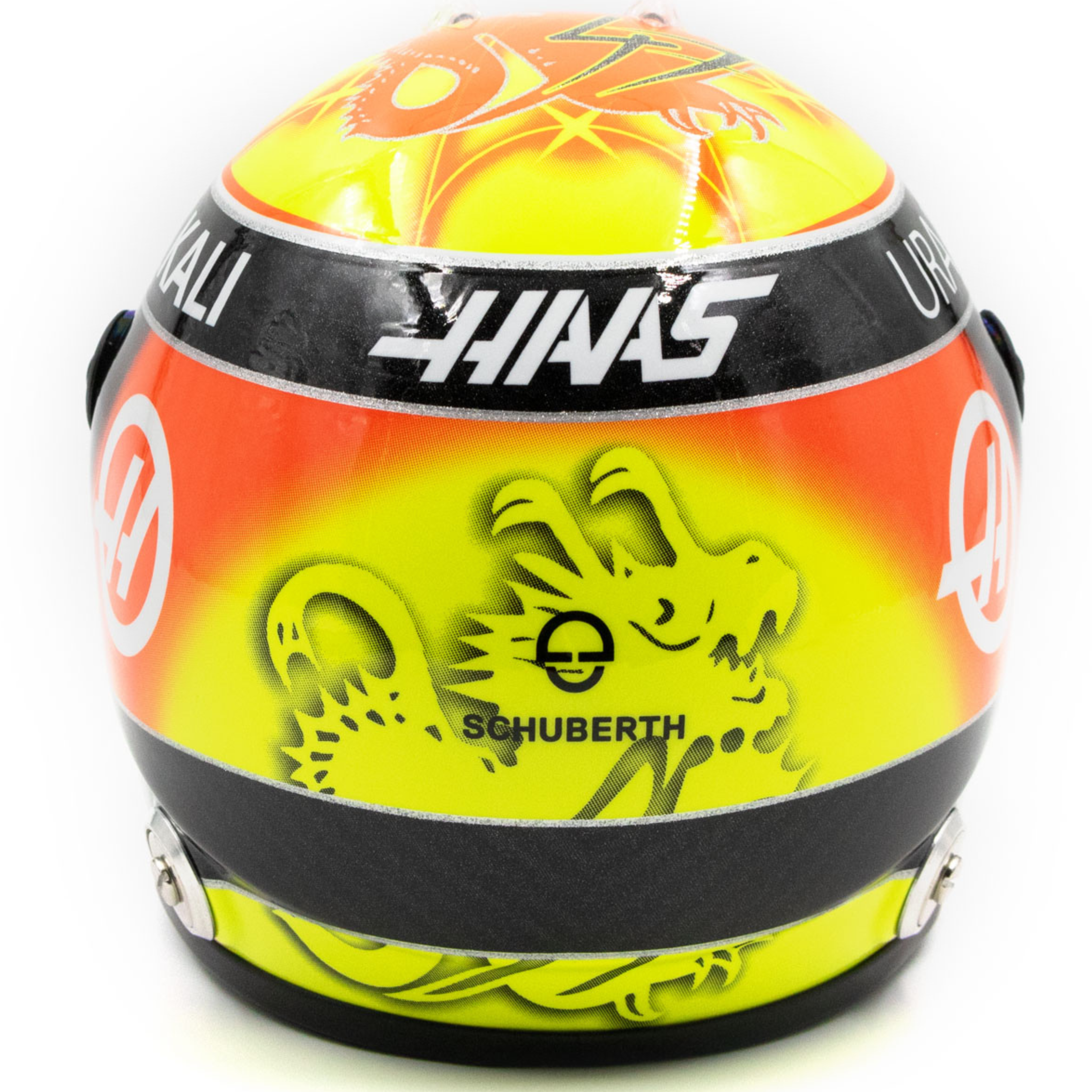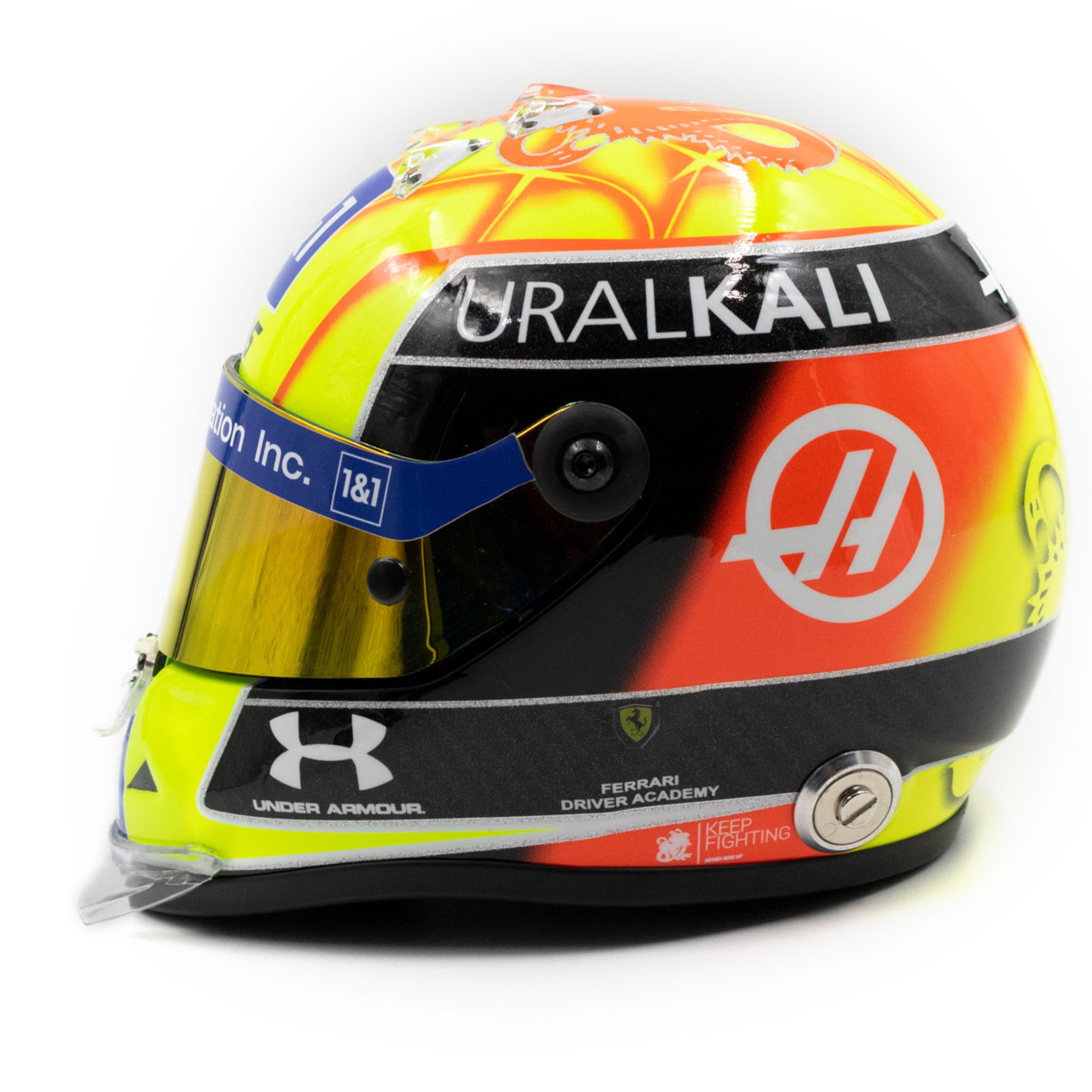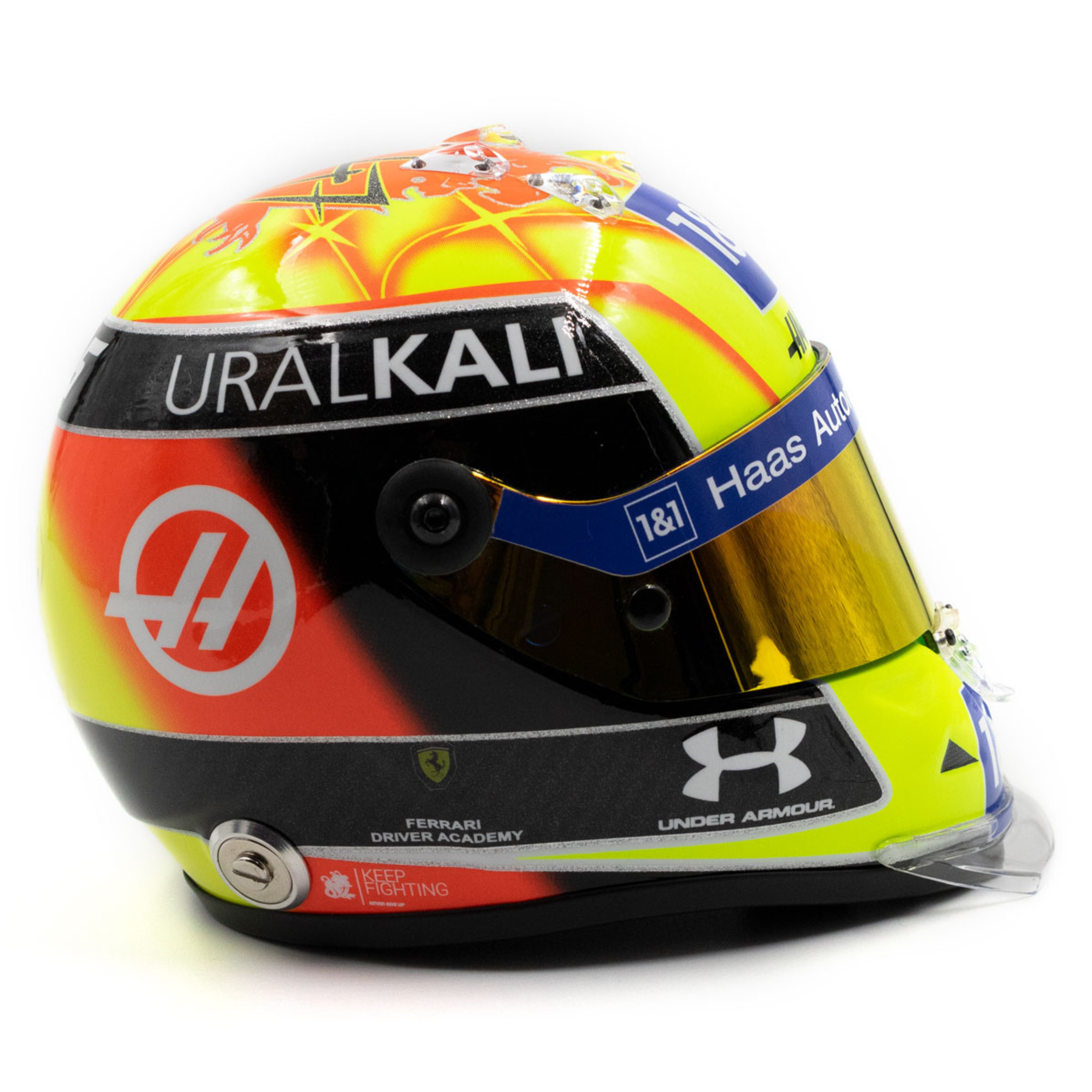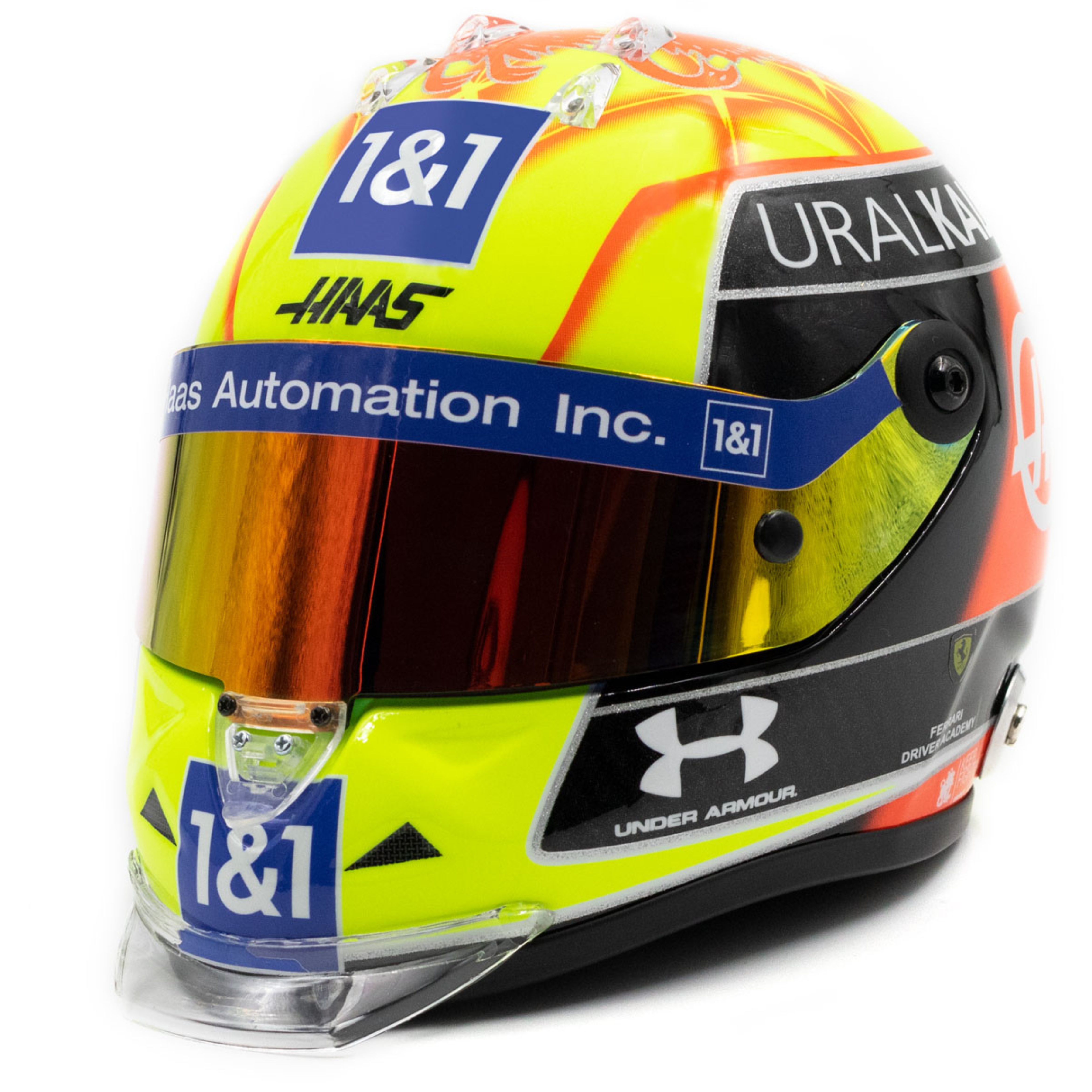 Mick Schumacher's miniature helmet from his first Formula 1 season 2021 The 1/2 scale miniature helmet is a faithful replica of the helmet worn by driver Mick Schumacher from his first Formula 1 season in 2021 with the Haas F1 team, which he wore from the British Grand Prix in Silverstone. The paintwork combines Mick's personal design in red/yellow with the colors of the German flag in black/red/gold. The manufacturer Schuberth is known for its quality and first-class work. Not only Mick Schumacher's helmets, but also those of his father Michael were manufactured by Schuberth at one time. without display case 1/2 scale Formula 1 season 2021 official Mick Schumacher product
