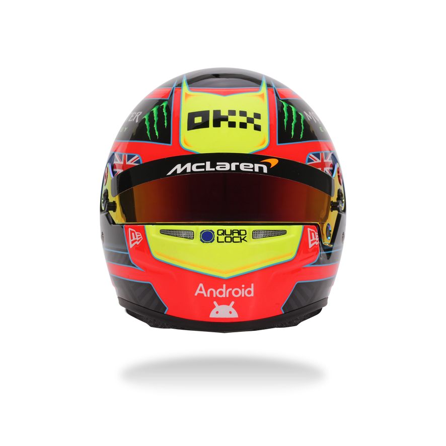 Oscar Piastri 2025 Minihelm im Maßstab 1:2, hergestellt von Bell Helmets. Oscar Piastri, auf dem Weg zum Formel-1-Titel 2025, wünschte sich ein Helmdesign, das seinem Look noch mehr Flair verleiht. Seine charakteristischen Farben werden mit einem schärferen und aggressiveren Finish kombiniert – eingerahmt von der australischen Flagge auf beiden Seiten und seinem persönlichen Logo auf der Rückseite. Ein Design, das die Denkweise eines Fahrers widerspiegelt, der seinen ersten Meistertitel anstrebt.
