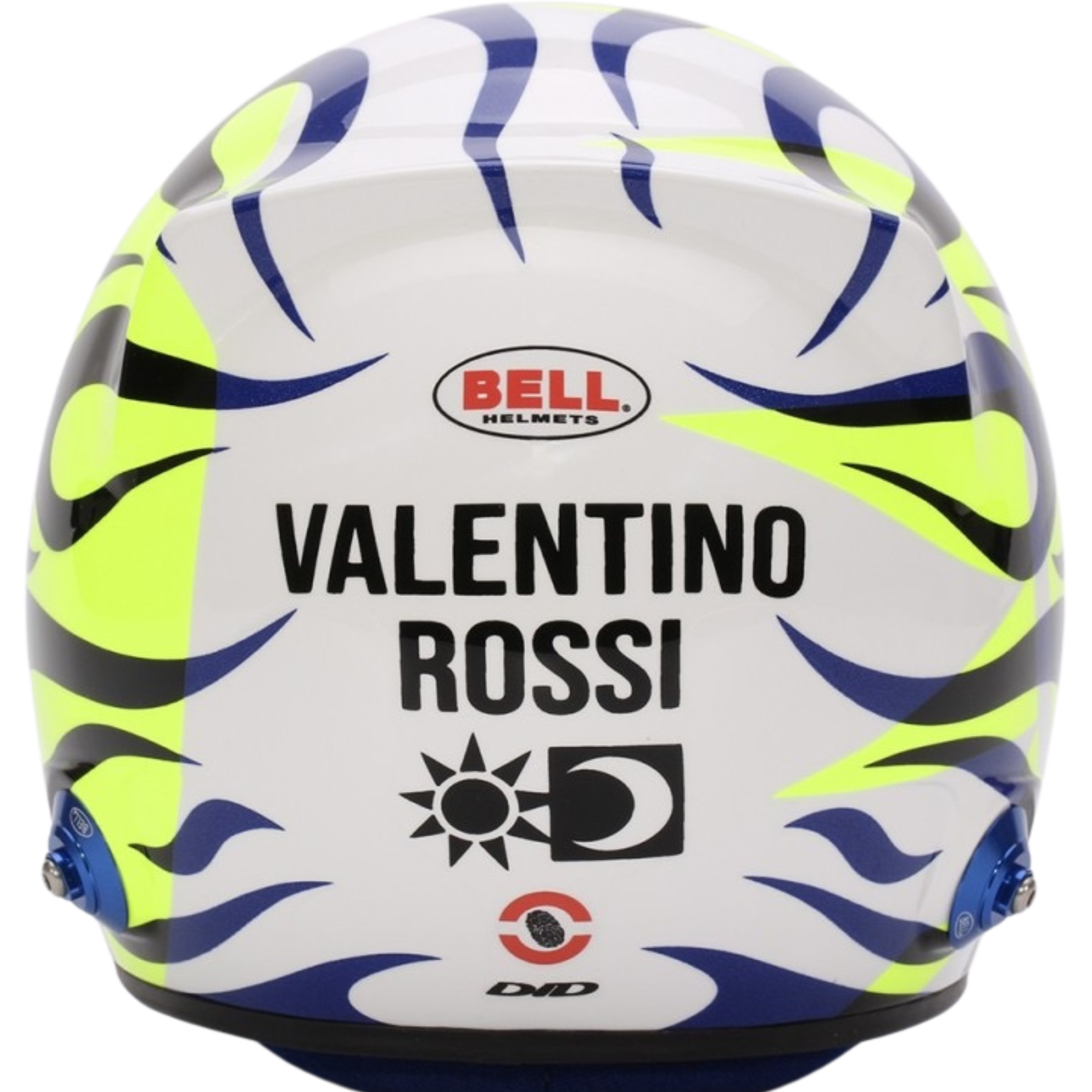 Minihelm 2023 des Motorrad- und Rennfahrers Valentino Rossi, eingesetzt in der GT World Challenge Europe. Exakte Nachbildung aus Druckguss im Maßstab 1:2