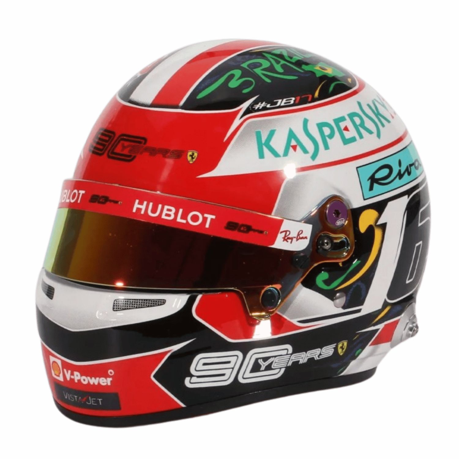 Mini prilba v mierke 1:2 špeciálnej prilby, ktorú nosil Leclerc v Austine a Brazílii v roku 2019, s grafikou USA/Brazílie a dizajnom 90 rokov Ferrari. Limitovaná edícia vyrobených 256 kusov.