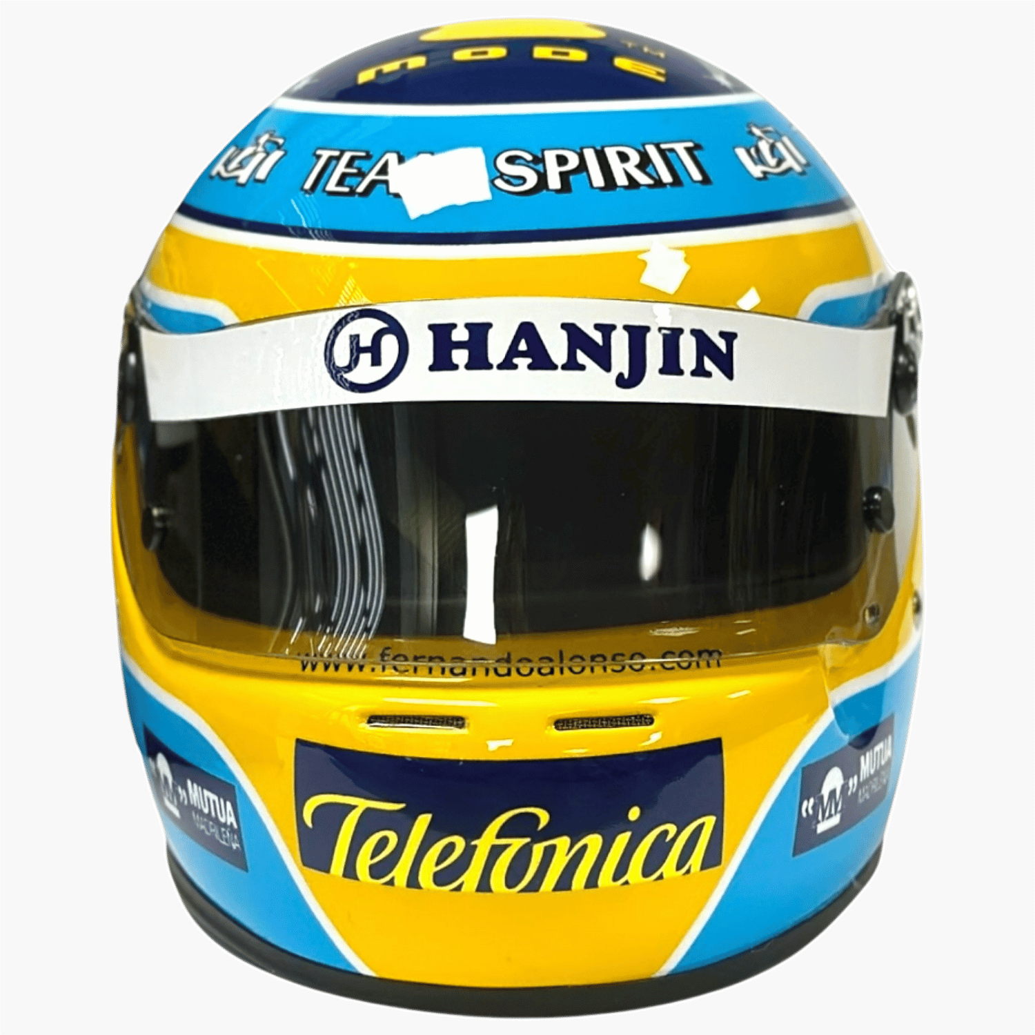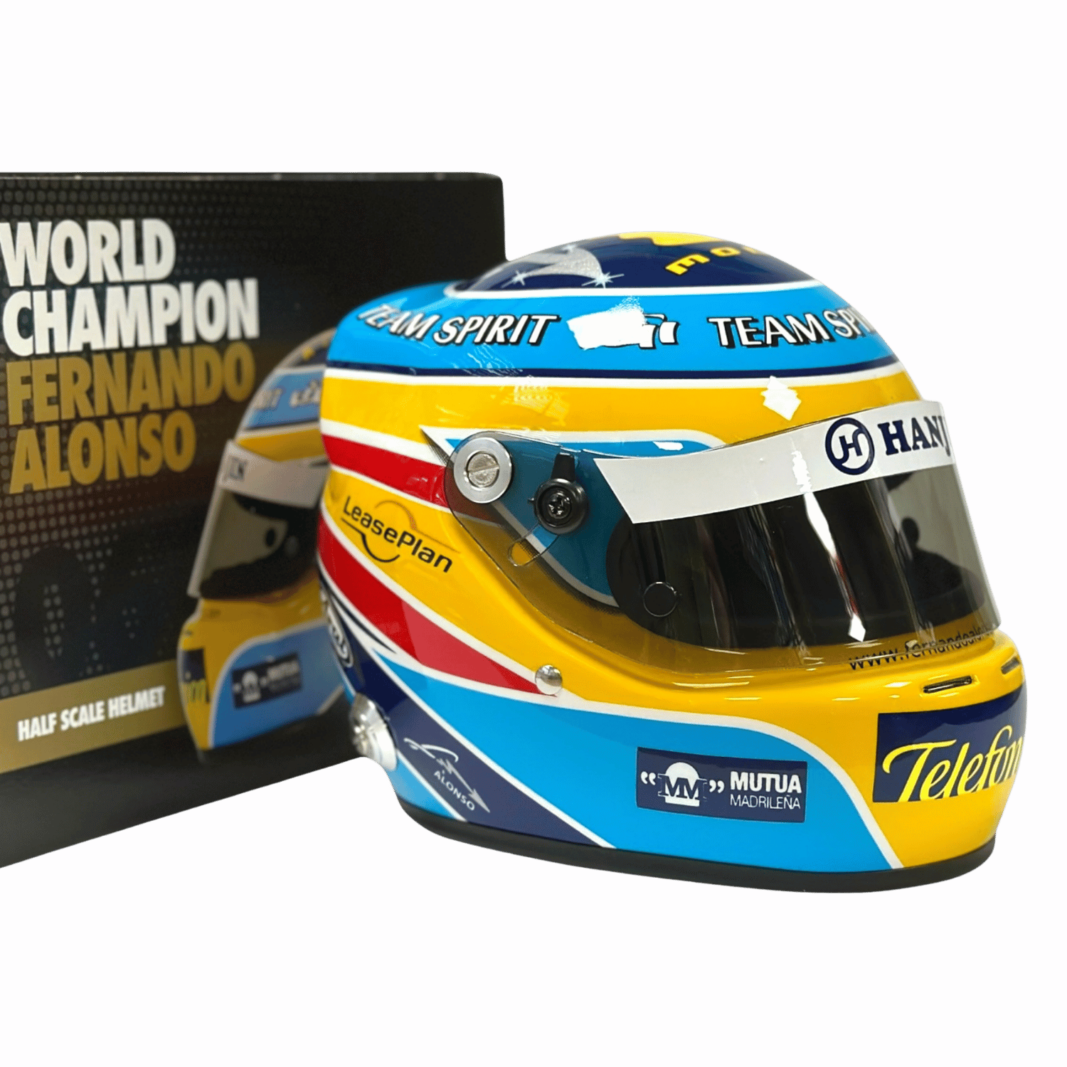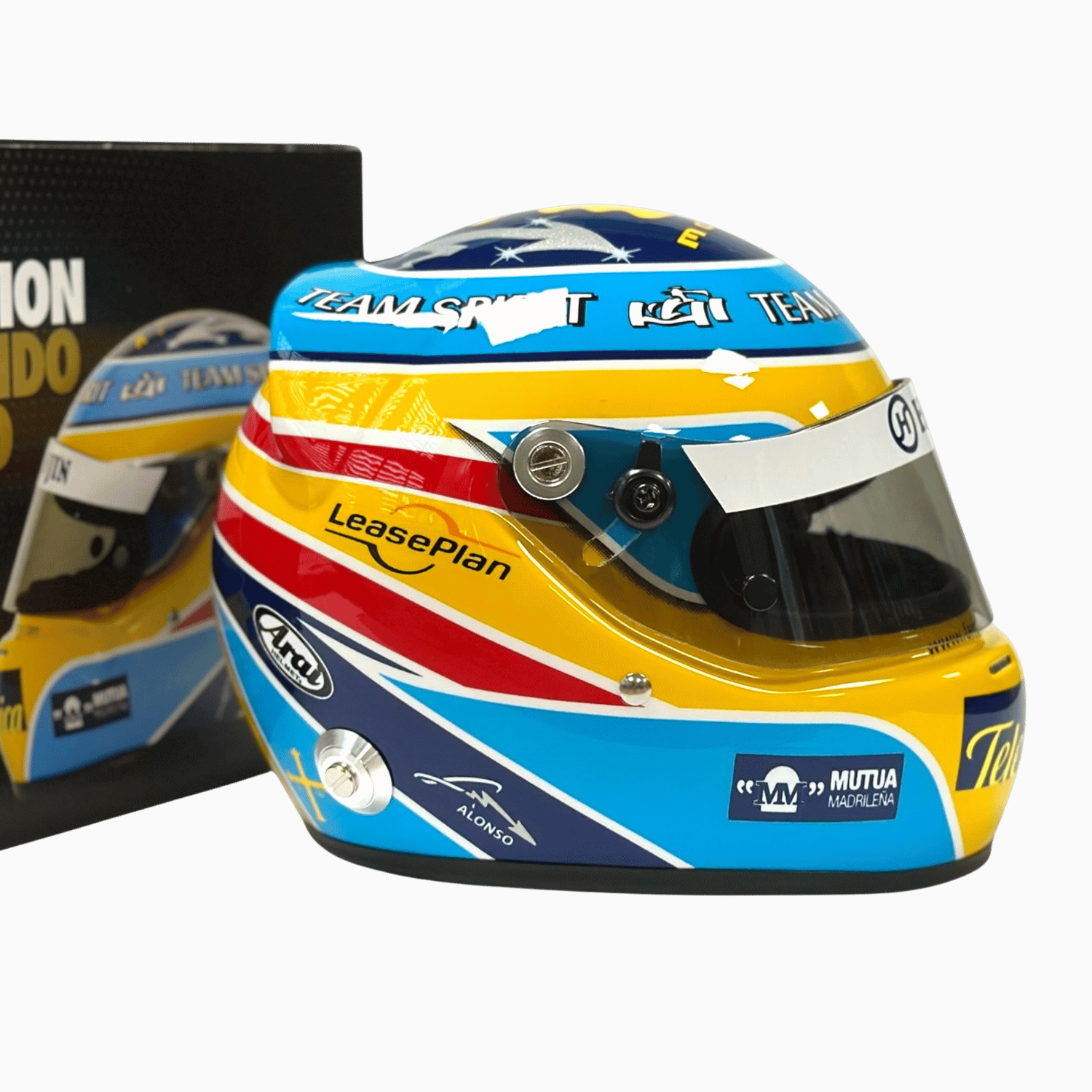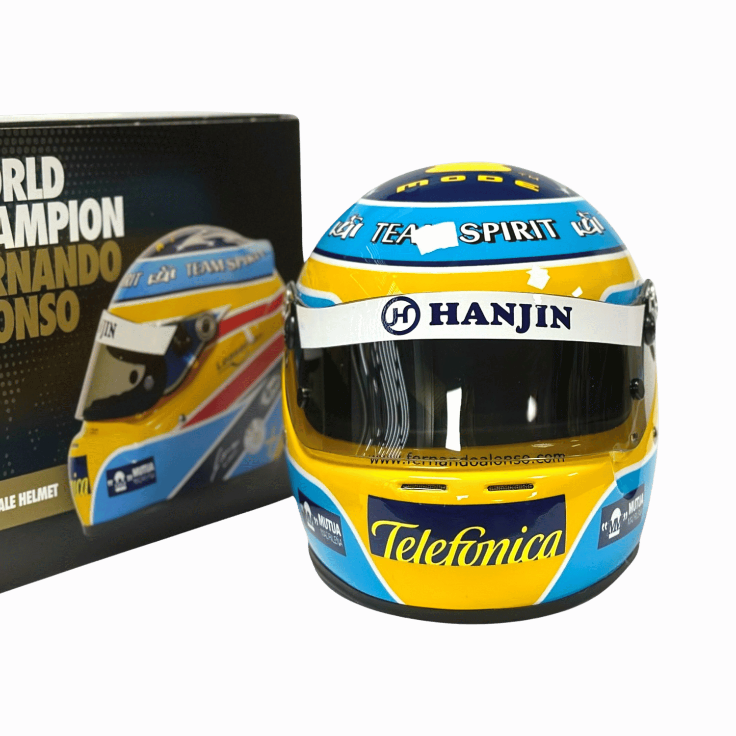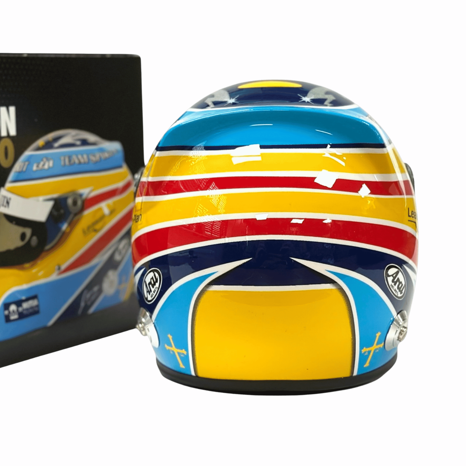 Fernando Alonso mini helmet from 2006. The mini helmet was released in limited quantities to celebrate 20 years of the Renault team's title. Scale 1:2, manufacturer Arai.