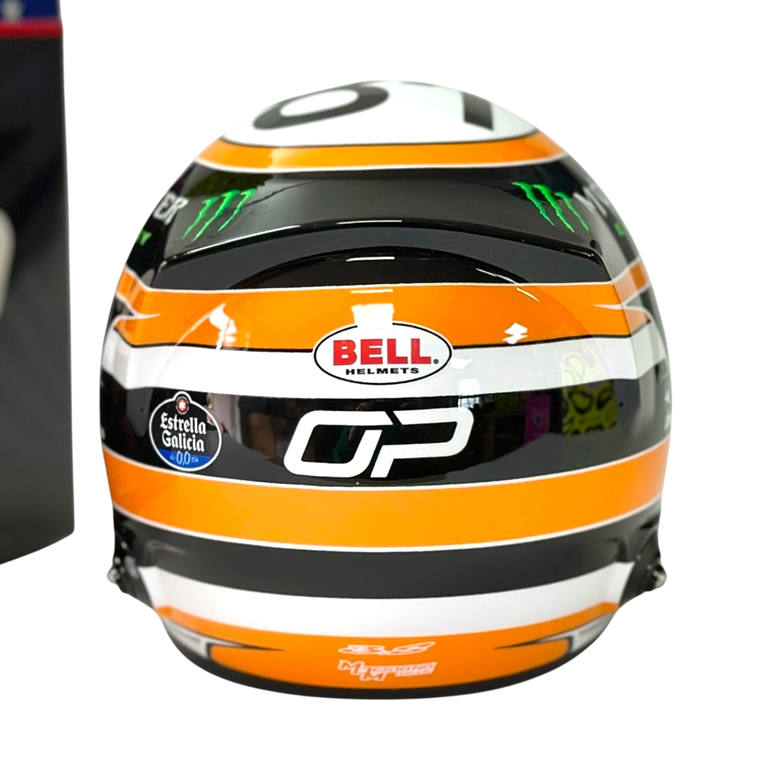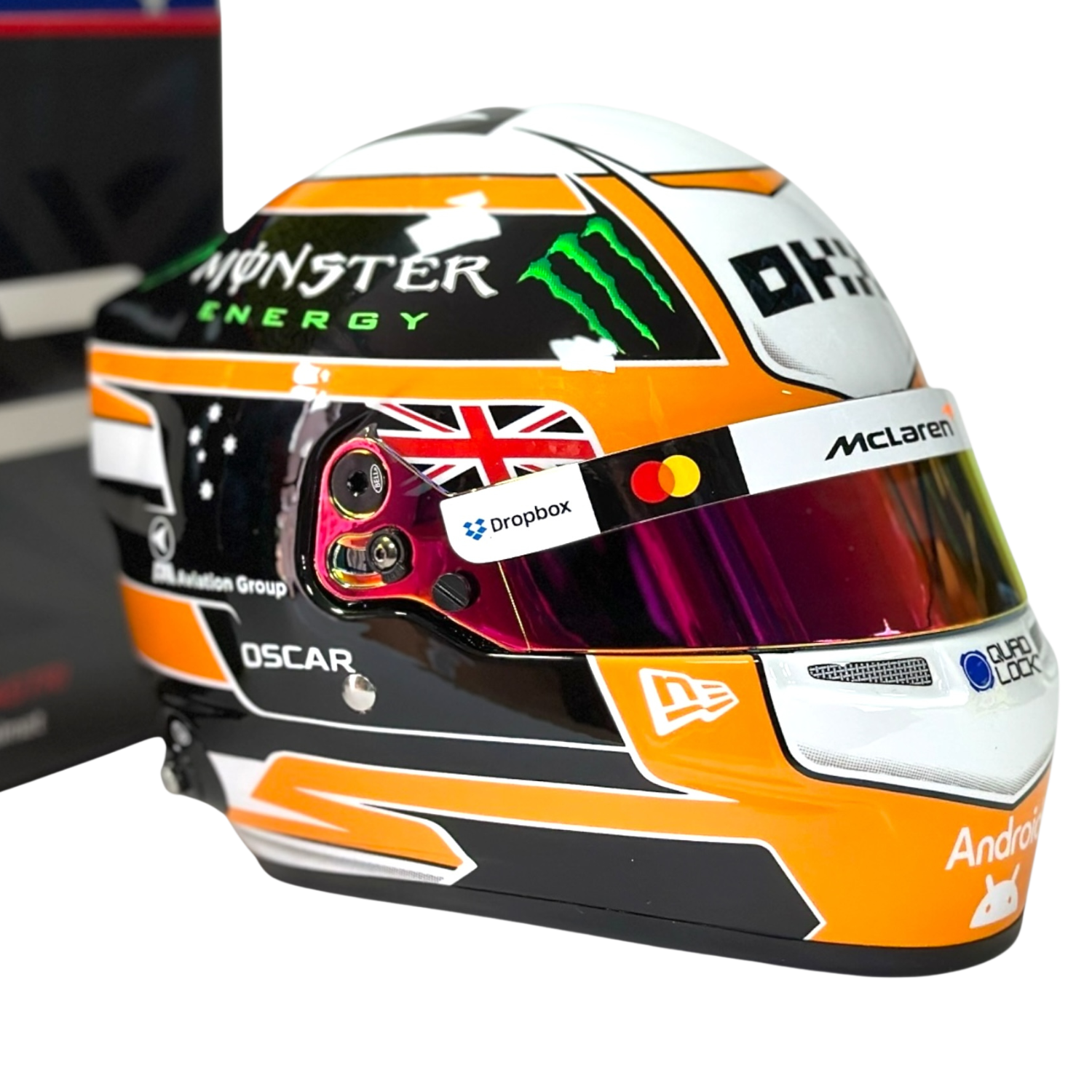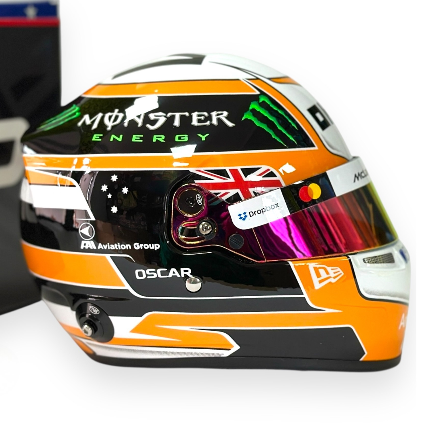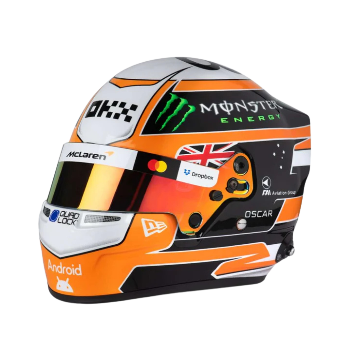 Oscar Piastra, a McLaren csapat pilótájának mini bukósisakja különleges dizájnban a 2025-ös Monacói Nagydíjra. A mini bukósisak korlátozott mennyiségben kapható. 1:2 méretarány, a gyártó Bell sisakja.