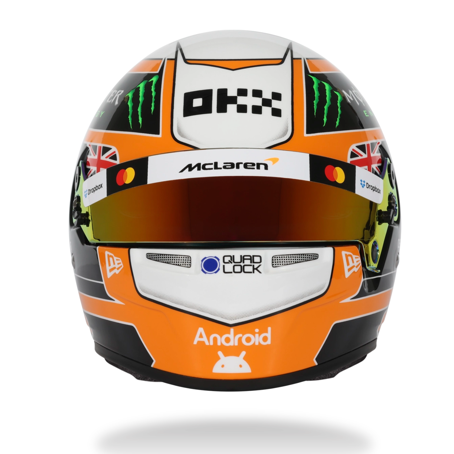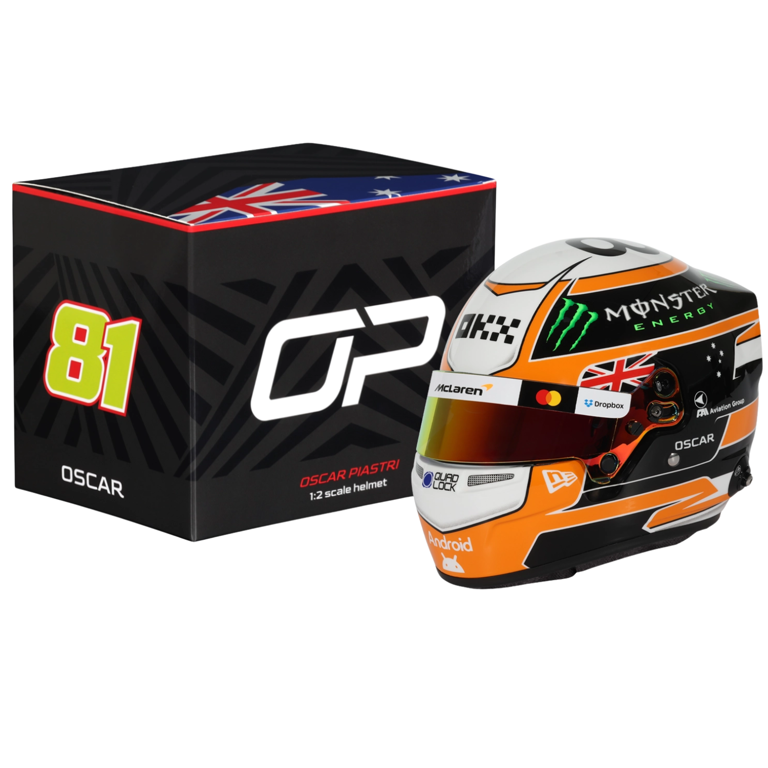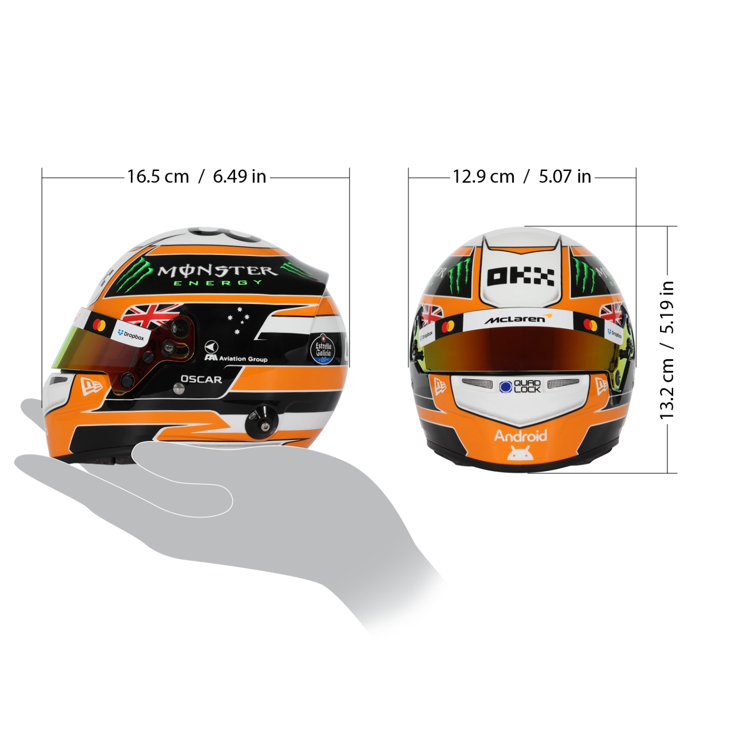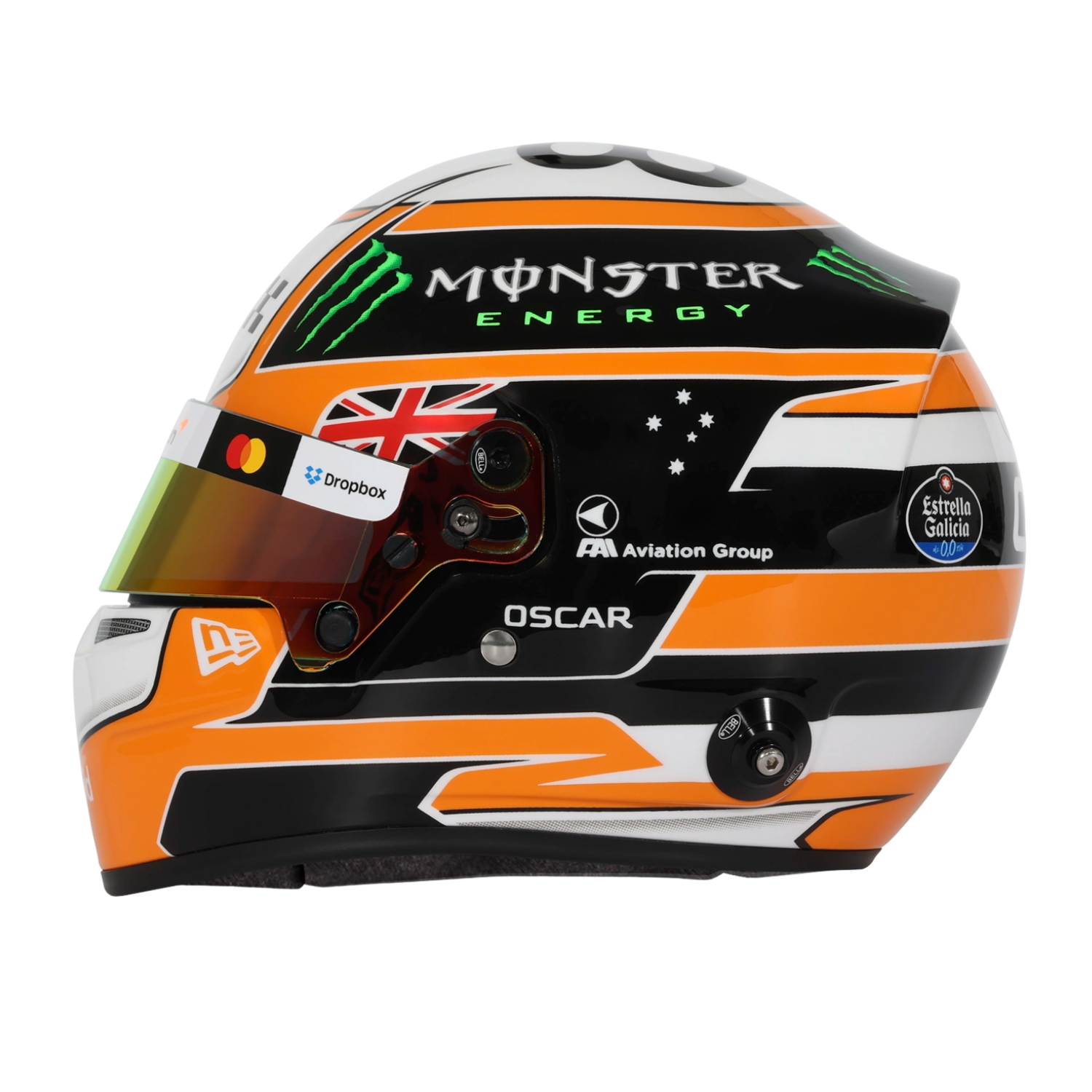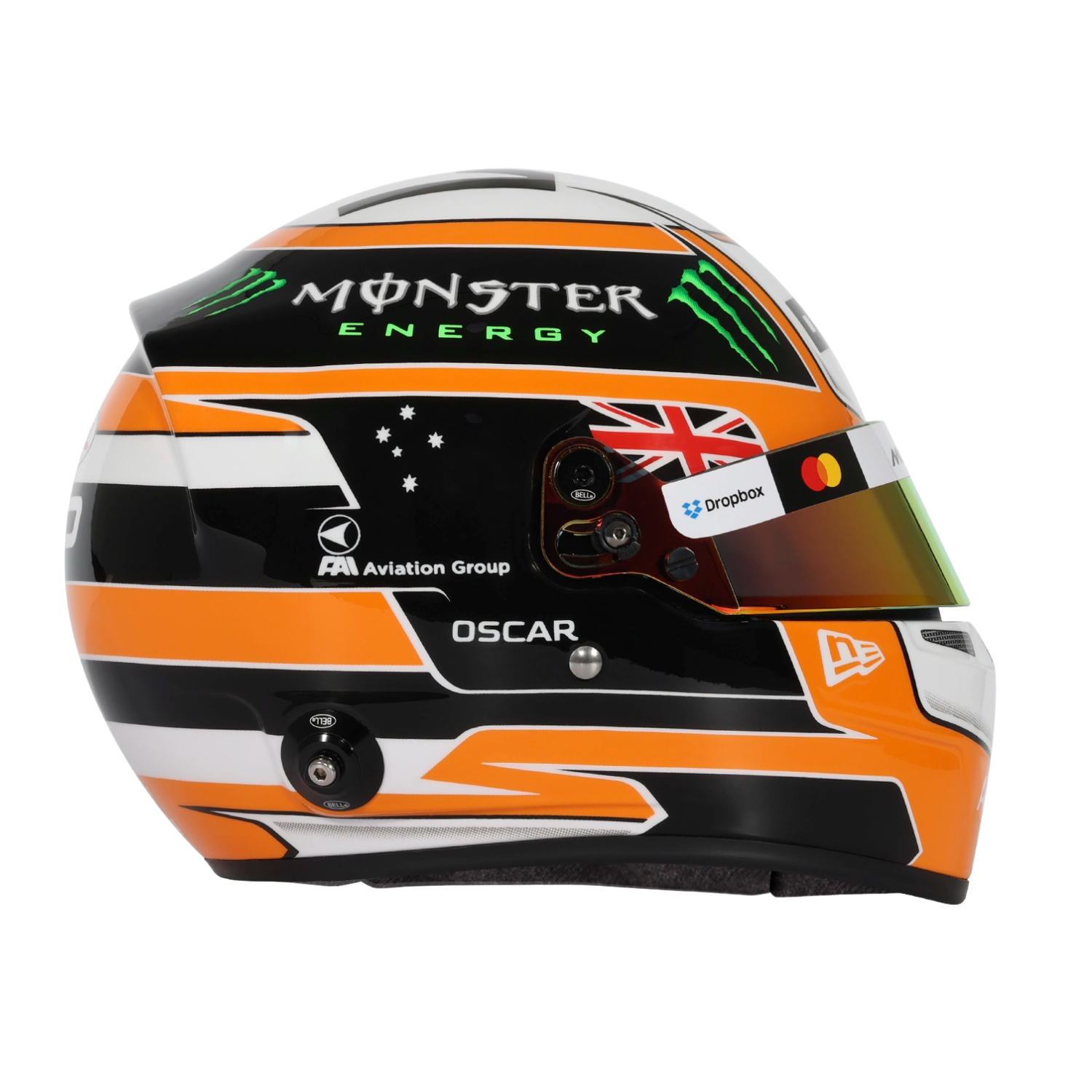 Mini prilba jazdca tímu McLaren Oscar Piastri v špeciálnom dizajne pre veľkú cenu Monaka v roku 2025. Mini prilba je vydaná v limitovanom množstve. Mierka 1:2, výrobca Bell helmets.