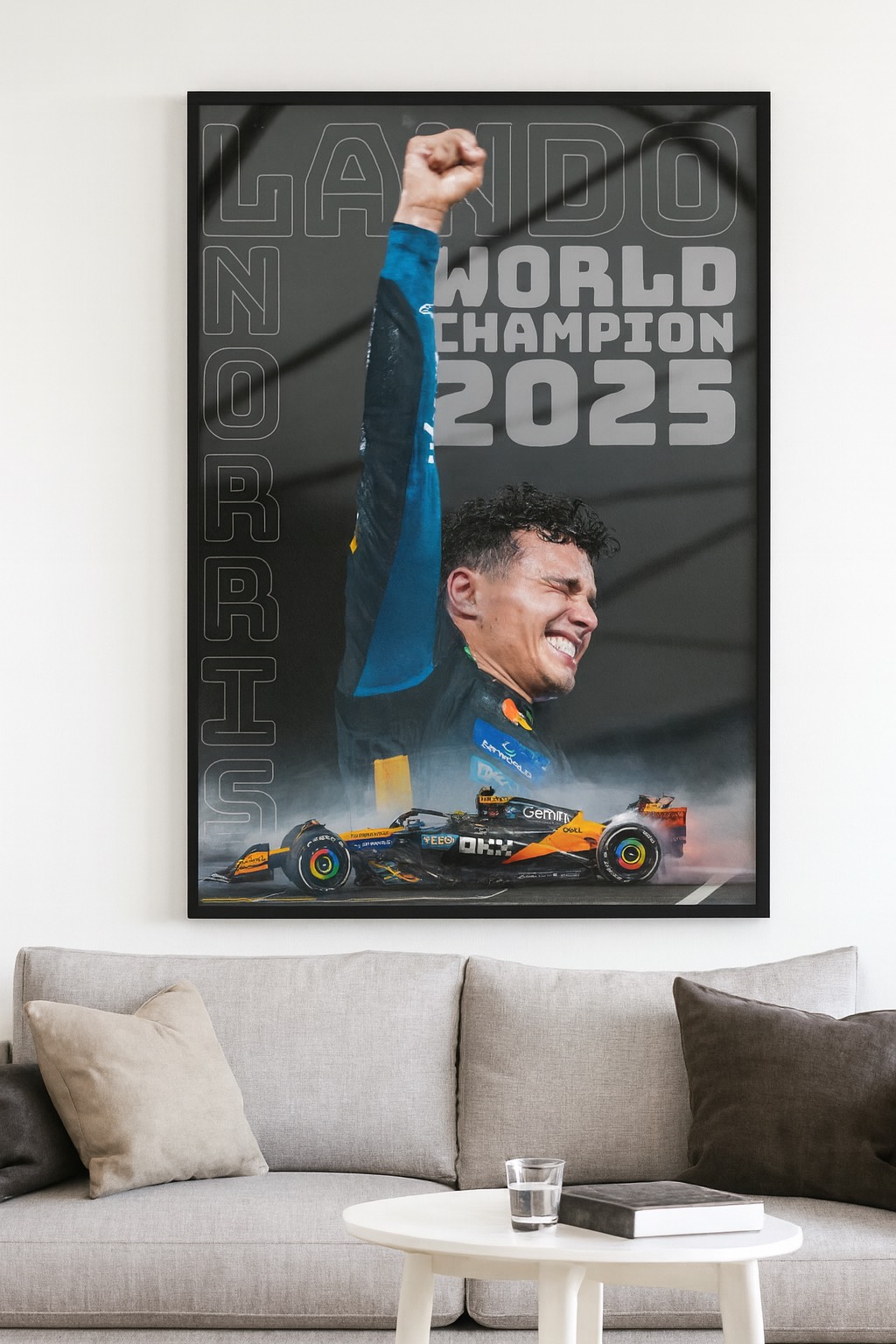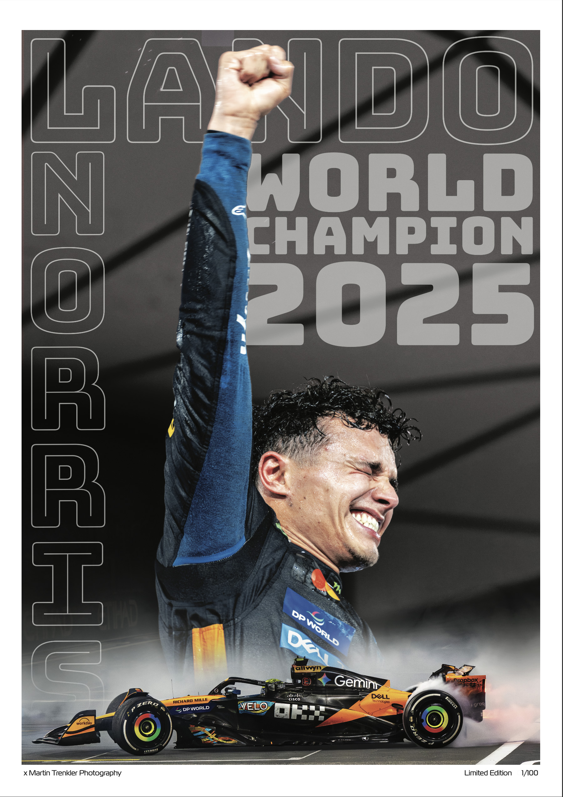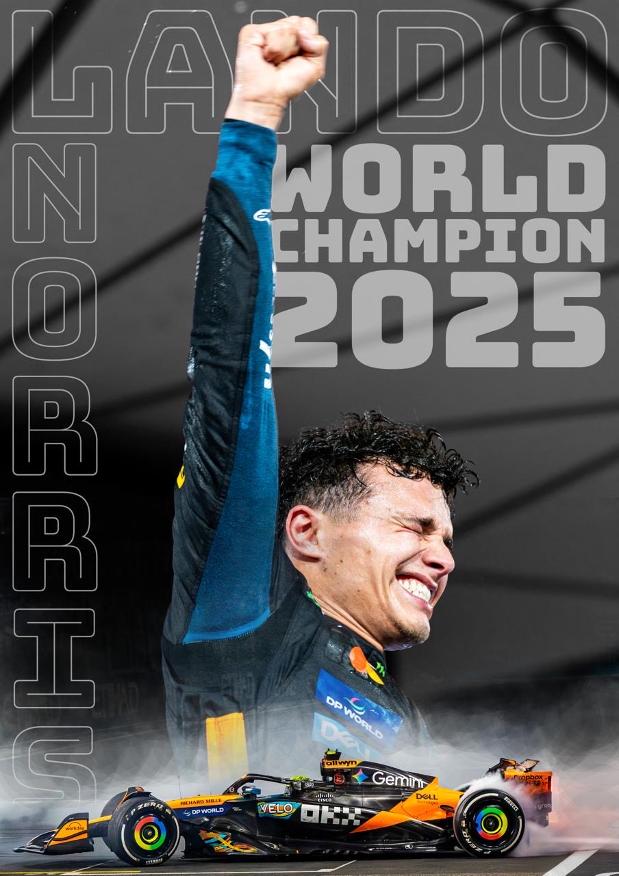 Celebrate the new F1 World Champion Lando Norris with an exclusive limited edition World Champion 2025 poster by photographer Martin Trenkler! Only 100 numbered and trademarked copies are available. Own a piece of F1 history in a unique way!