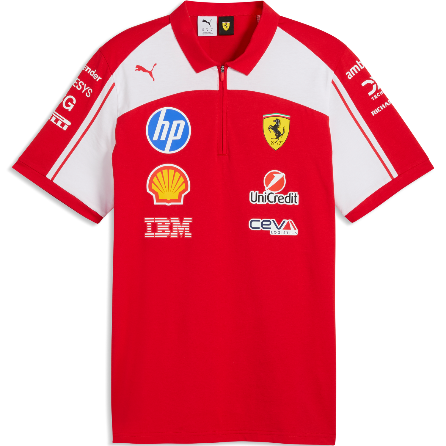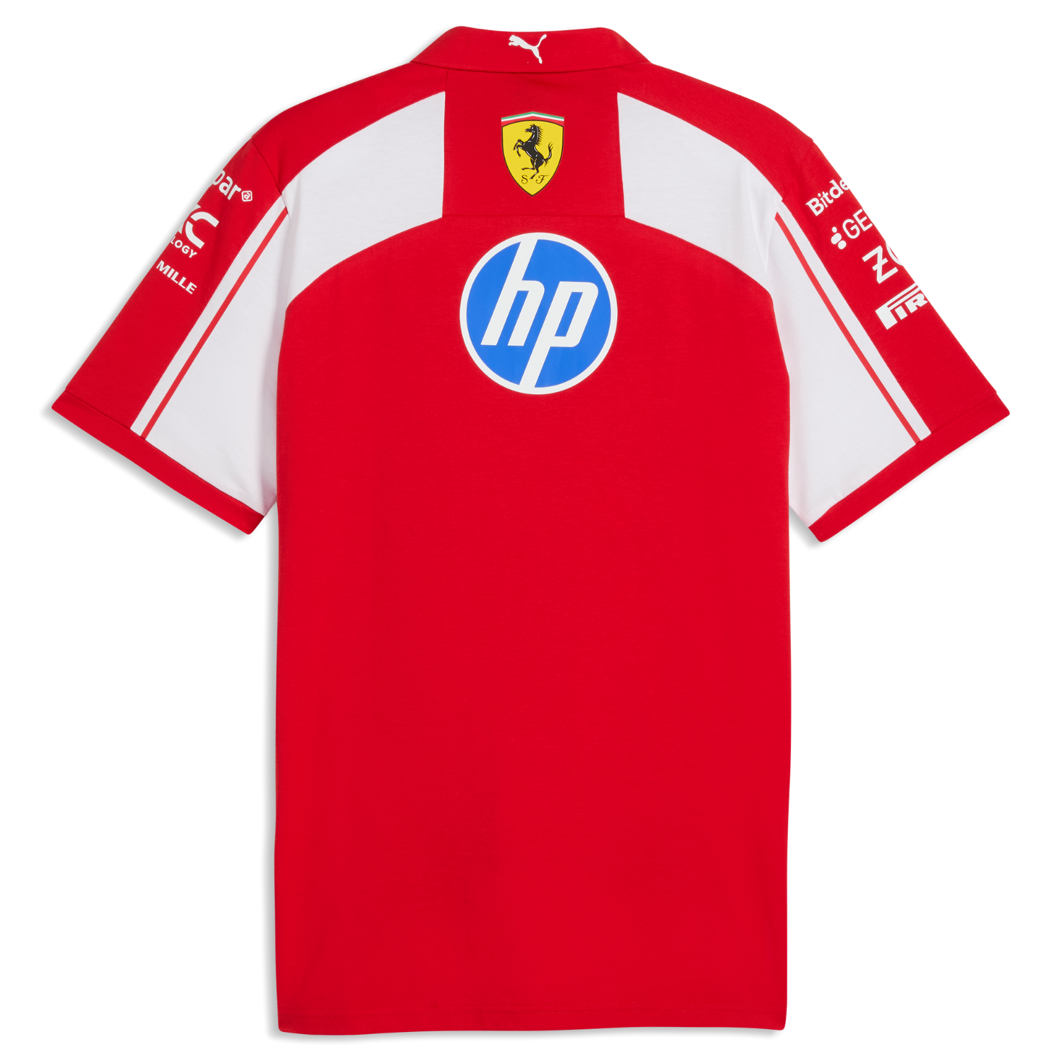 A polo shirt inspired by the one worn by the Scuderia Ferrari HP team during the 2026 Formula 1 World Championship season. It combines racing style with everyday comfort. The iconic Scuderia Red base is highlighted by contrasting white details on the upper chest and sleeves, while the classic collar and short sleeves ensure a comfortable fit and freedom of movement. The Ferrari Scudetto patch on the chest, Puma logo and official sponsor logos complete the garment dedicated to fans who look to the future with authentic racing spirit.