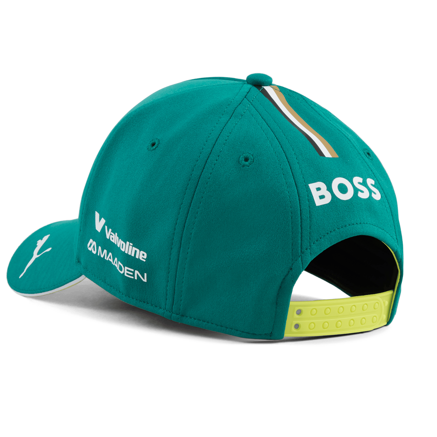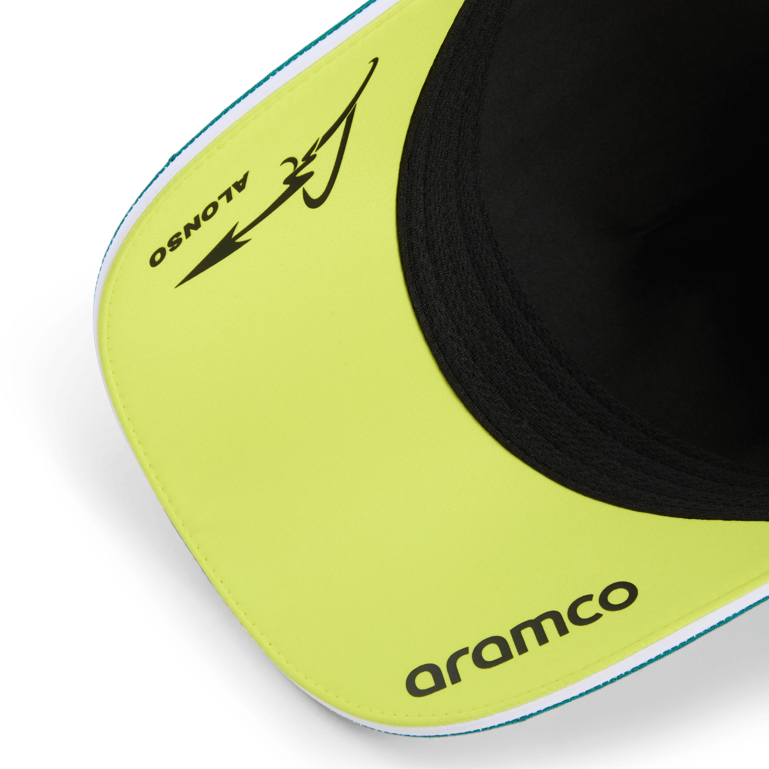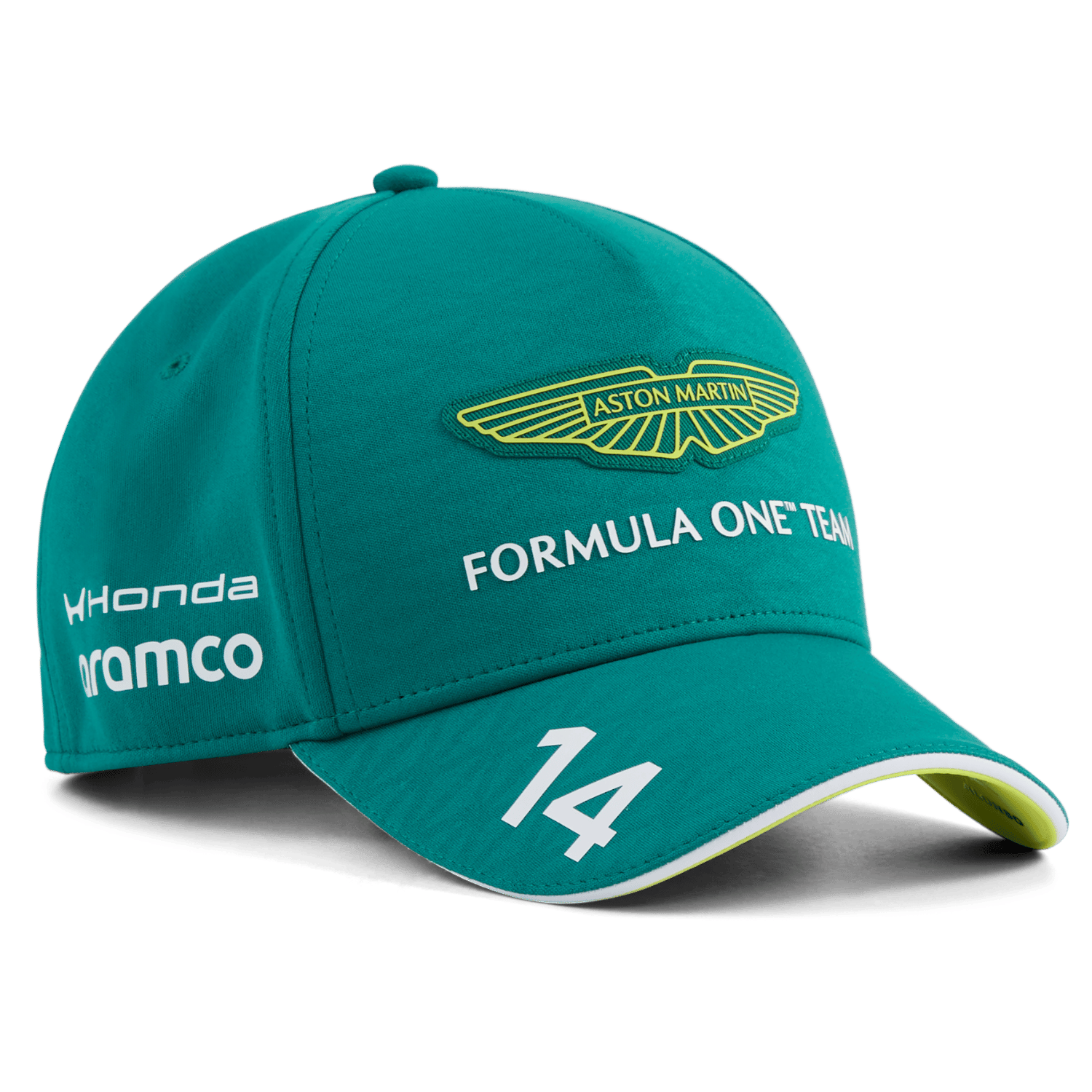 Official Fernando Alonso cap in iconic green. The Aston Martin team logo and sponsors are on the cap, and the number 14 is on the peak. The comfortable fit along with the adjustable back strap ensure comfort throughout the day.
