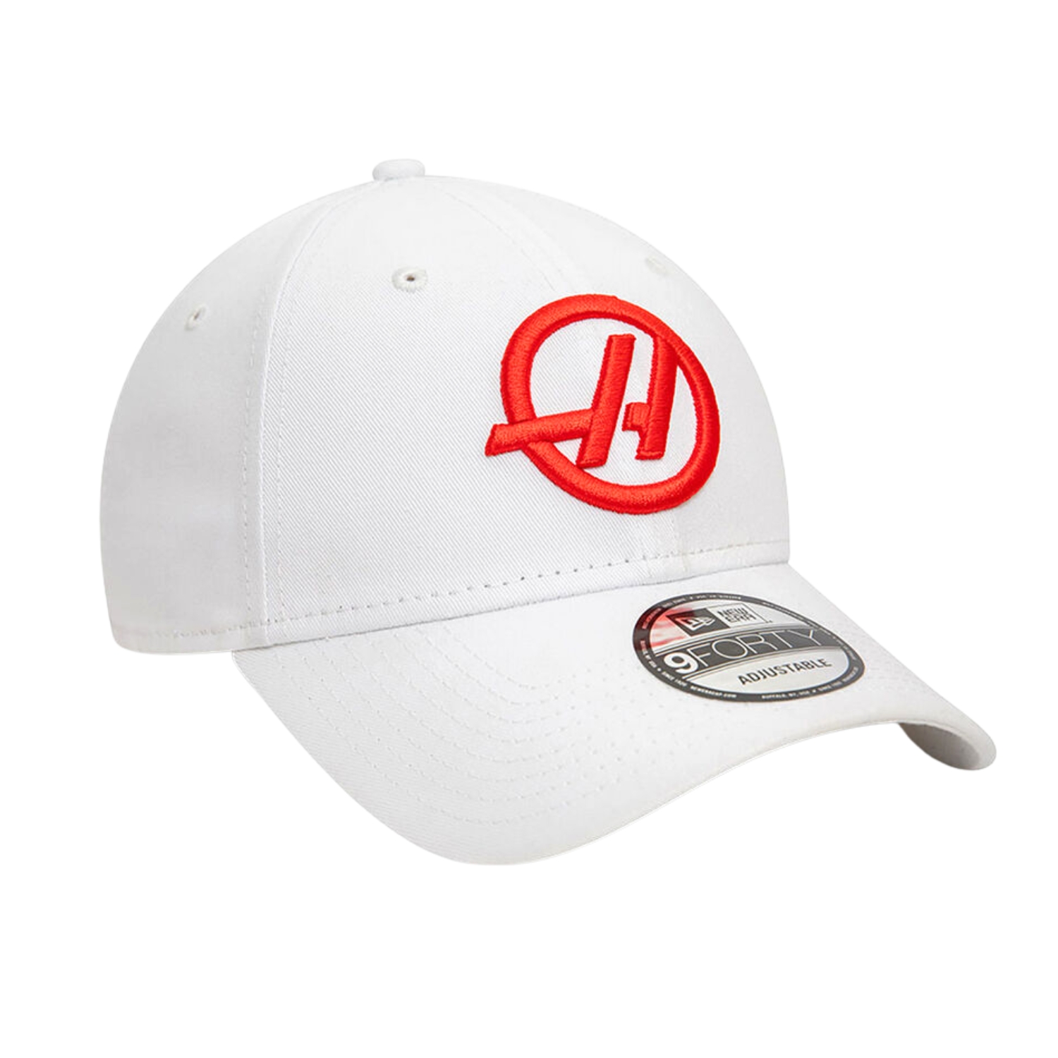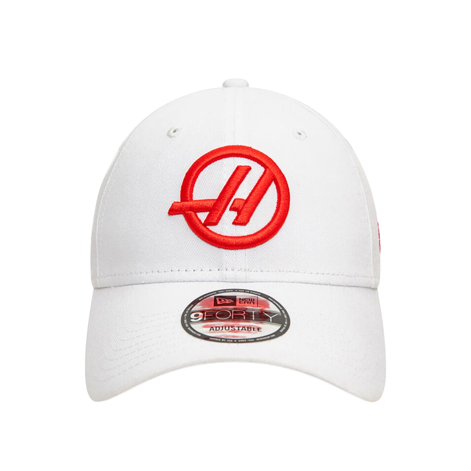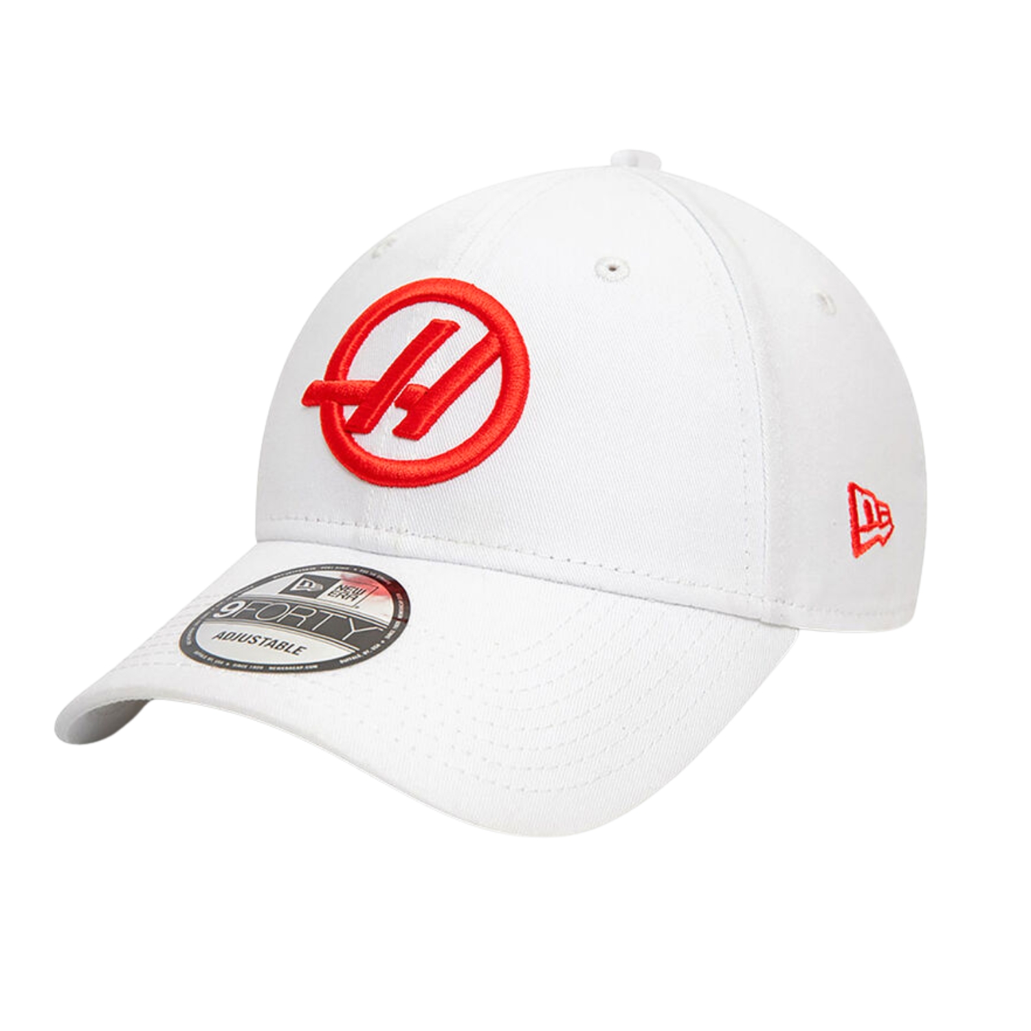 A sapka elején egy hímzett Haas F1 csapatlogó, az állítható 9FORTY sapka oldalán pedig egy New Era zászlólogó található.