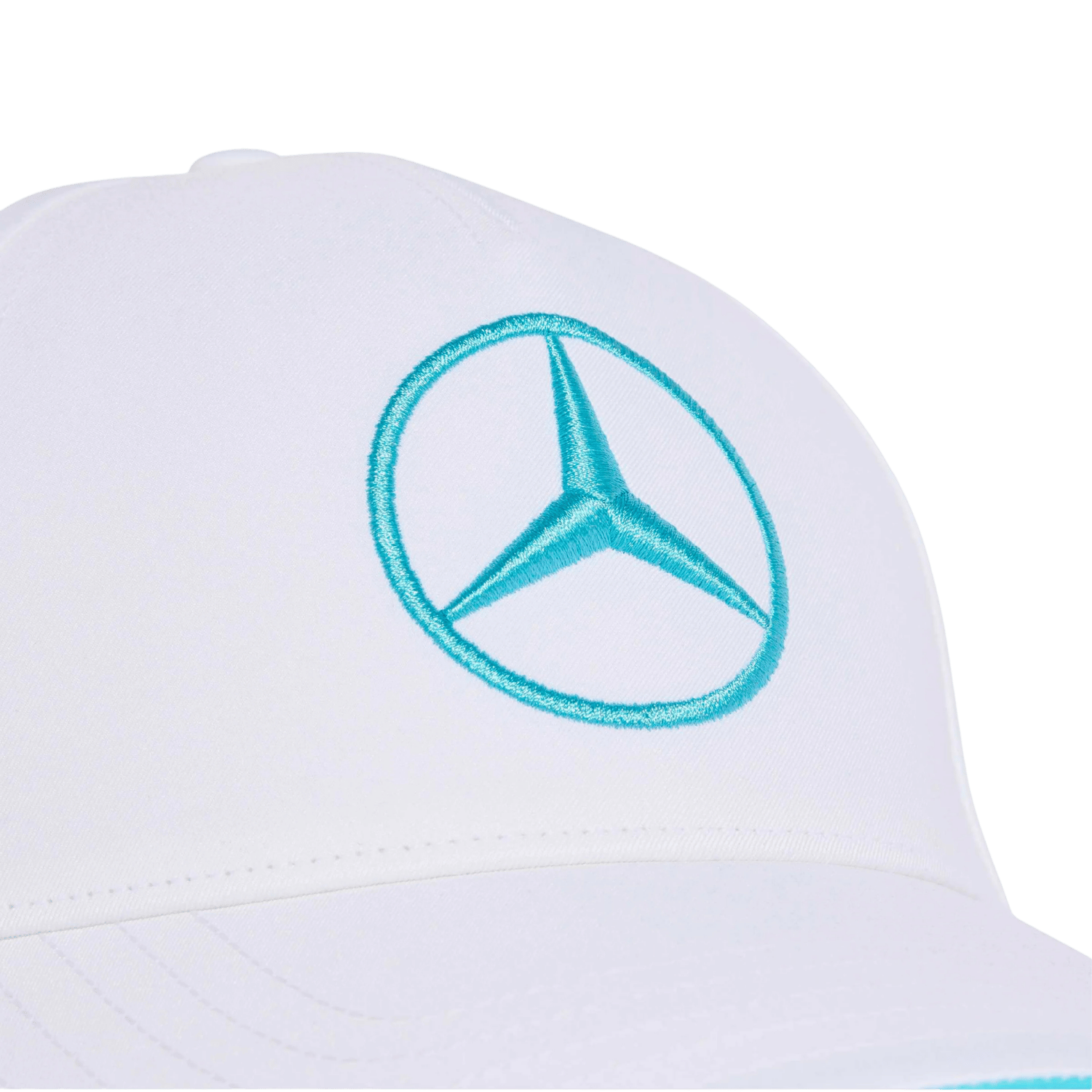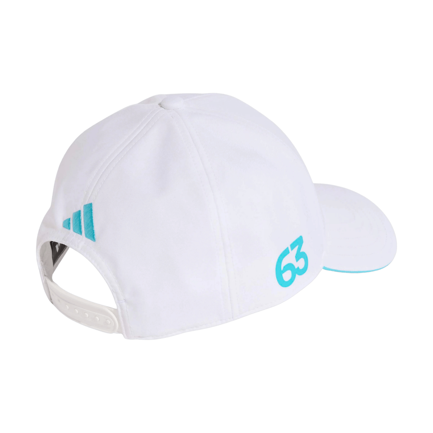 - Auf der Kappe befinden sich das Mercedes-Teamlogo, das Adidas-Herstellerlogo und die Startnummer 63