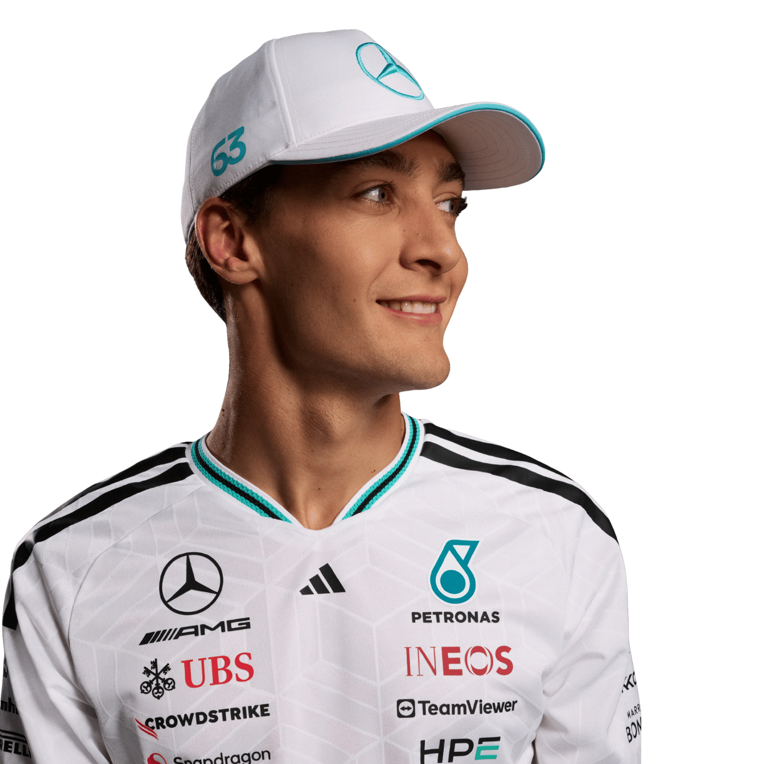 - On the cap the Mercedes team logo and the Adidas manufacturer logo and the race number 63
