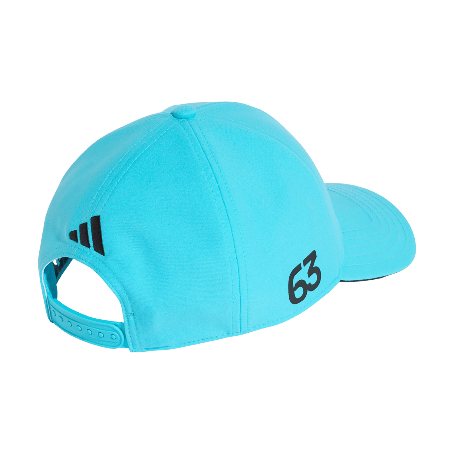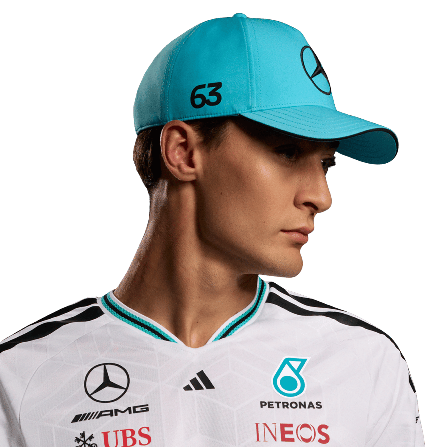 - Auf der Kappe das Mercedes-Teamlogo, das Adidas-Herstellerlogo und die Startnummer 63