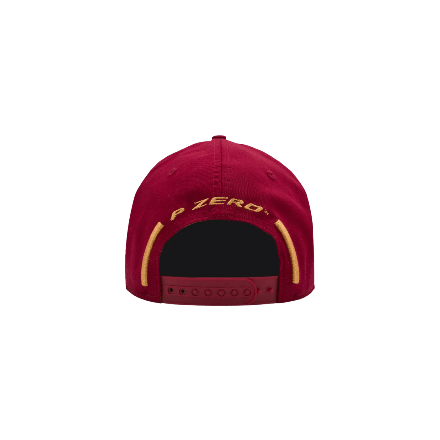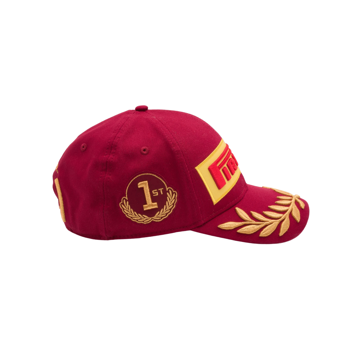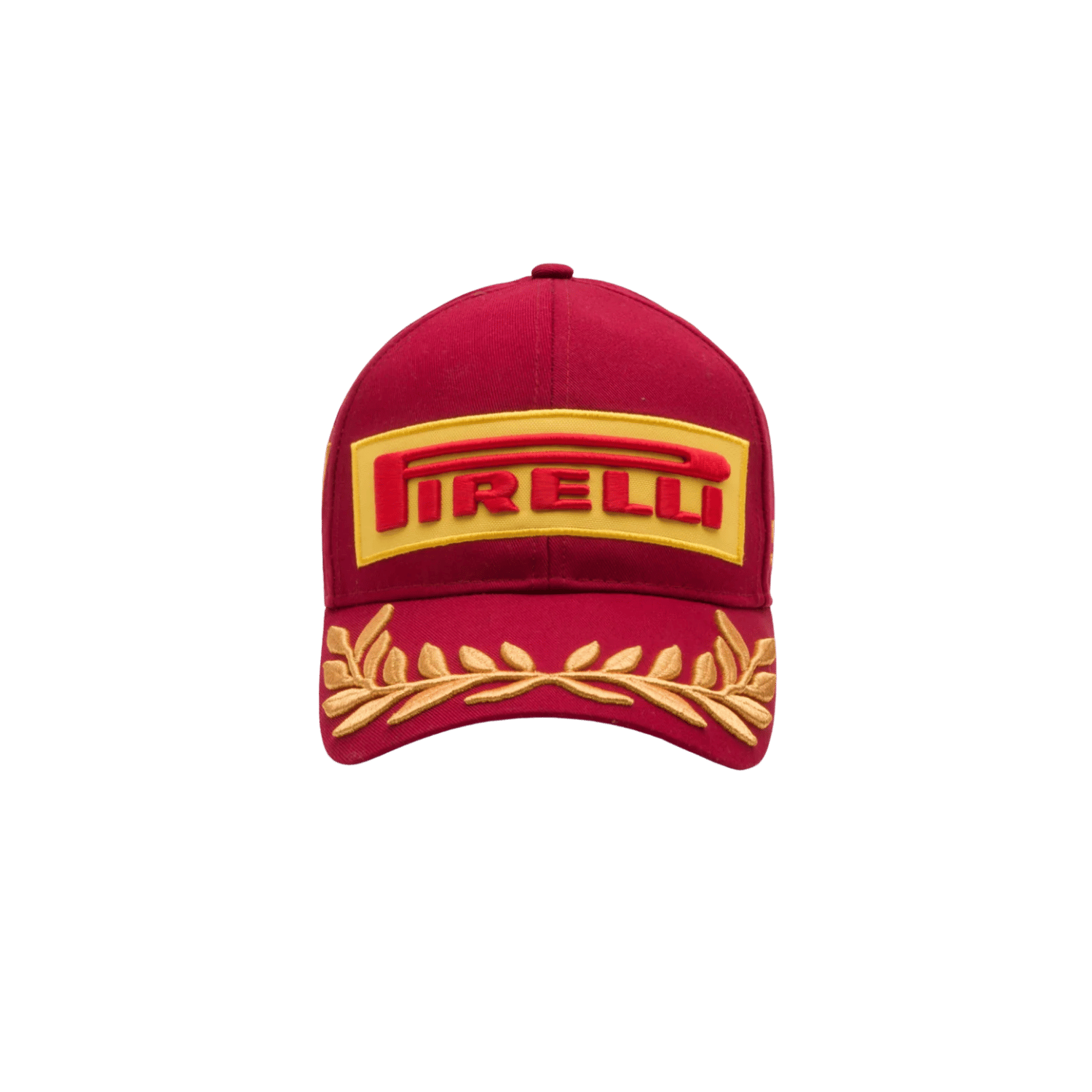 - The bottom of the red peak has a repeating yellow print of the Pirelli logo along the inner seam along with with golden geographical coordinates