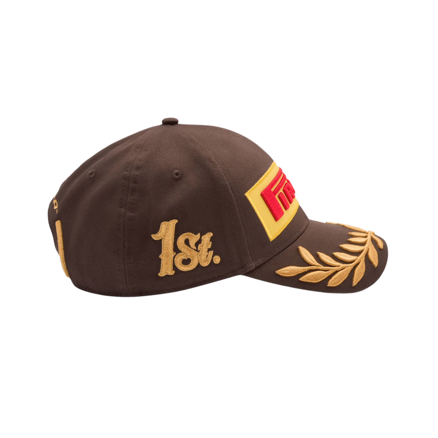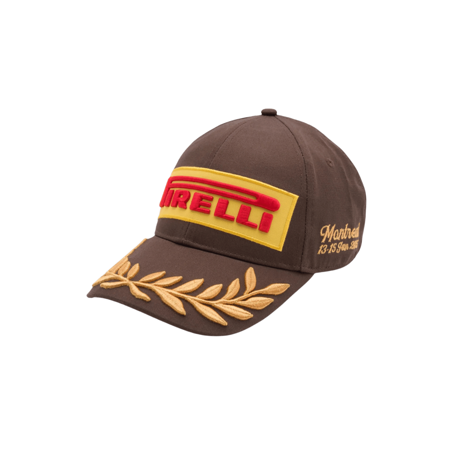 The Pirelli Podium Cap – Special Edition Canada 2025 embodies the raw, earthy energy of the Circuit Gilles Villeneuve with a rich brown background. A tribute to the rugged nature of racing on an island circuit surrounded by water and forest. Flashes of gold embroidery elevate the look with podium-worthy prestige, while a fiery red underbelly adds a burst of energy.