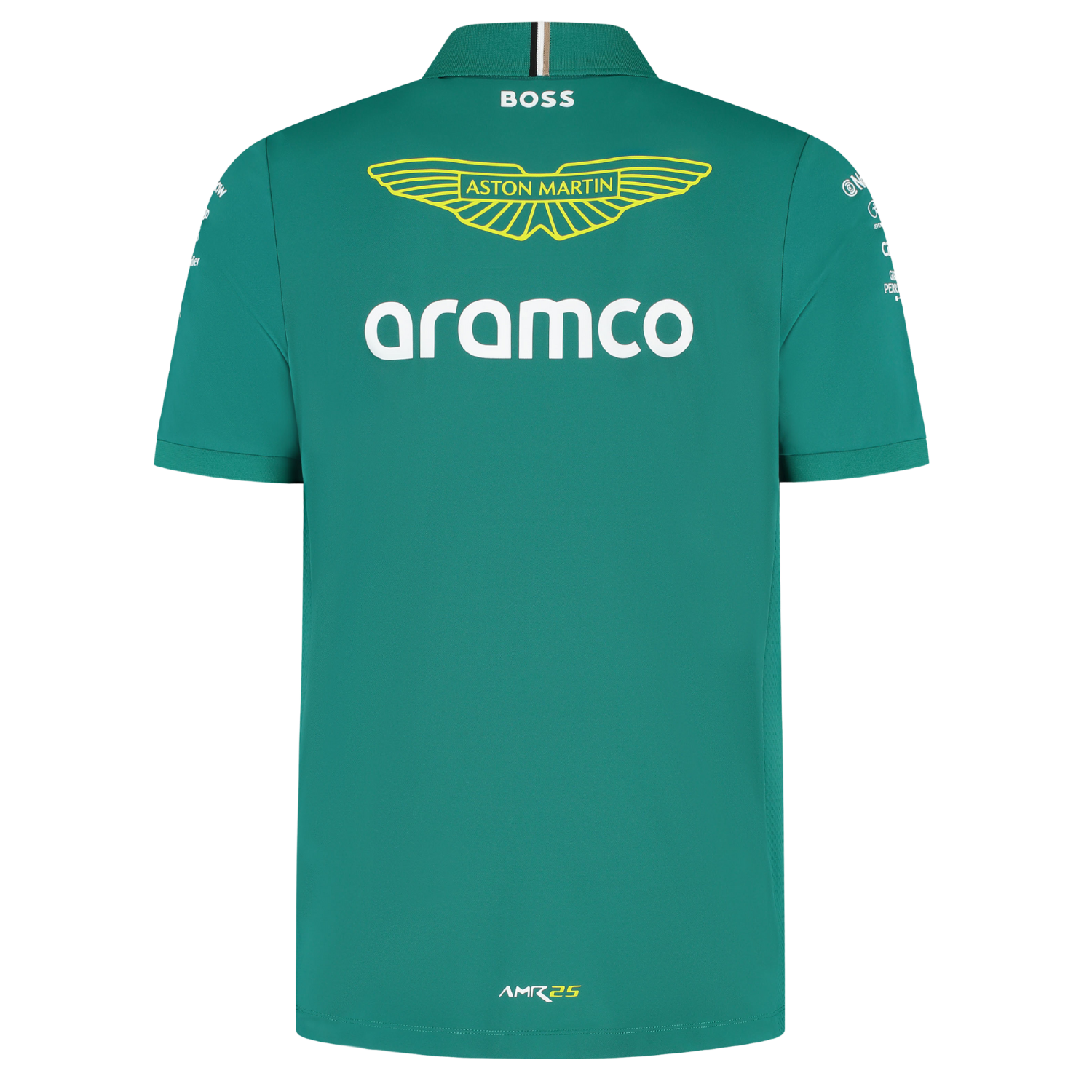 Aston Martin Team Poloshirt. Teamlogos und Sponsorenlogos auf dem Poloshirt. Reißverschluss im Nacken. Material 96 % Polyester, 4 % Elasthan.