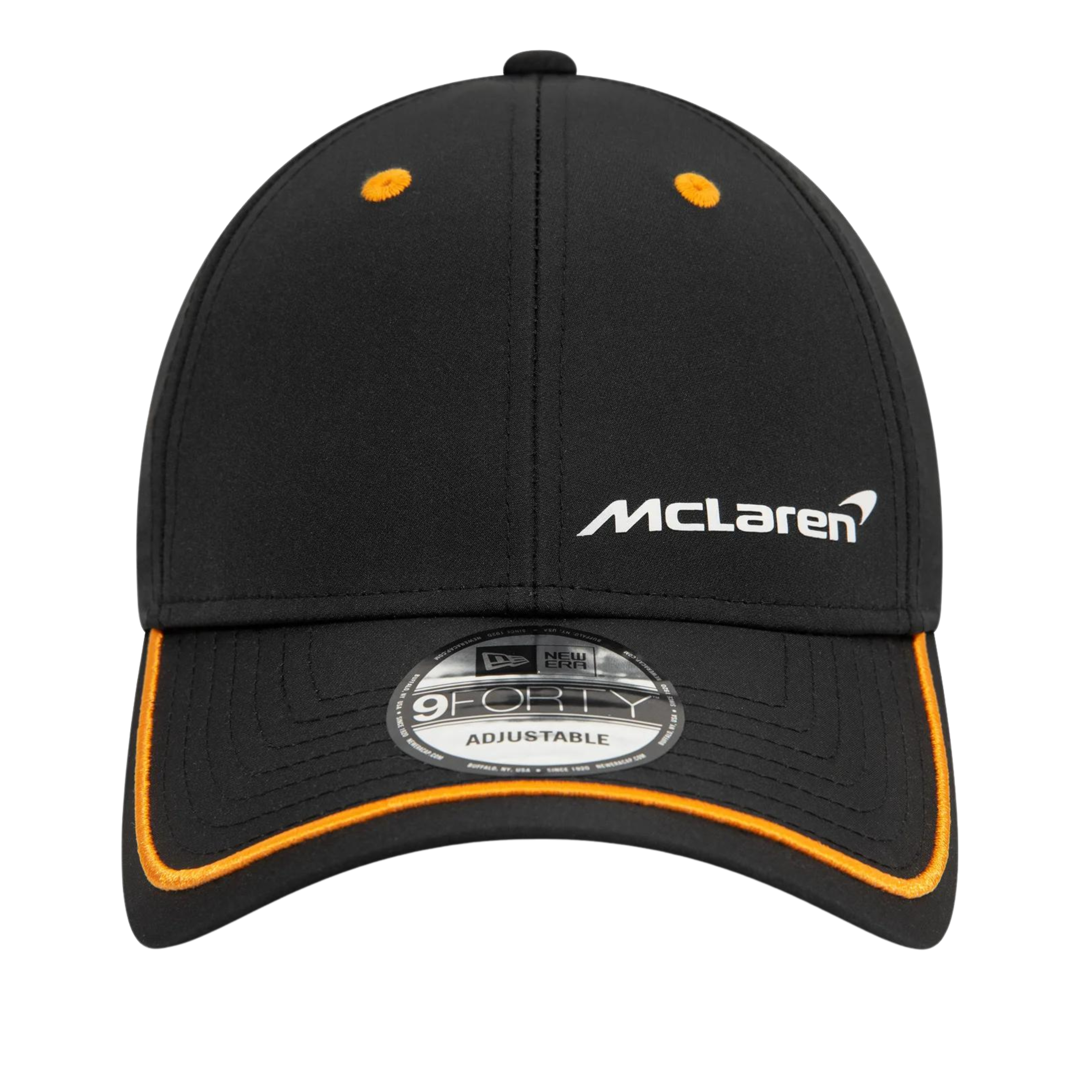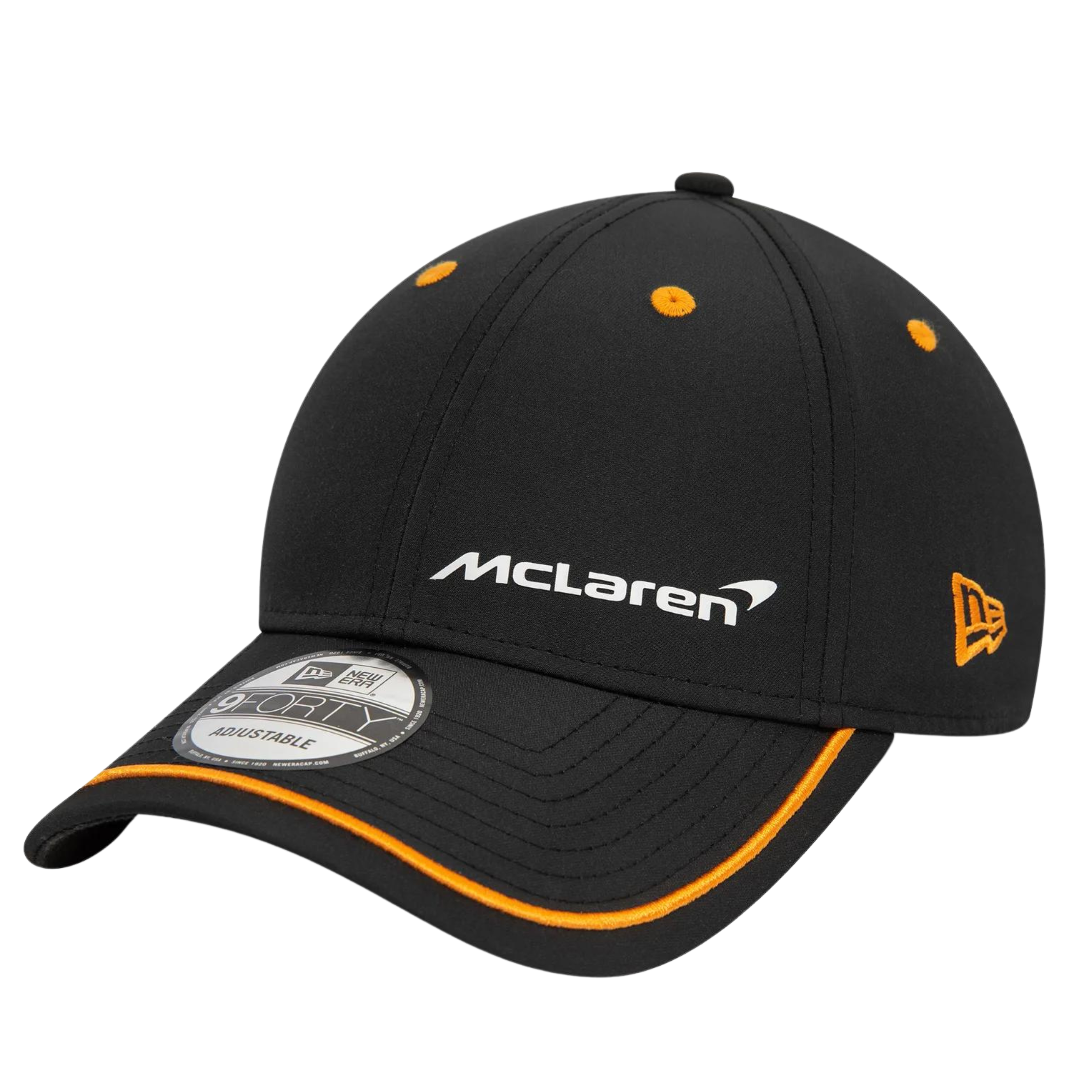 McLaren piping team cap, black. Team logo on the front and New Era manufacturer logo on the sides, adjustment strap on the back