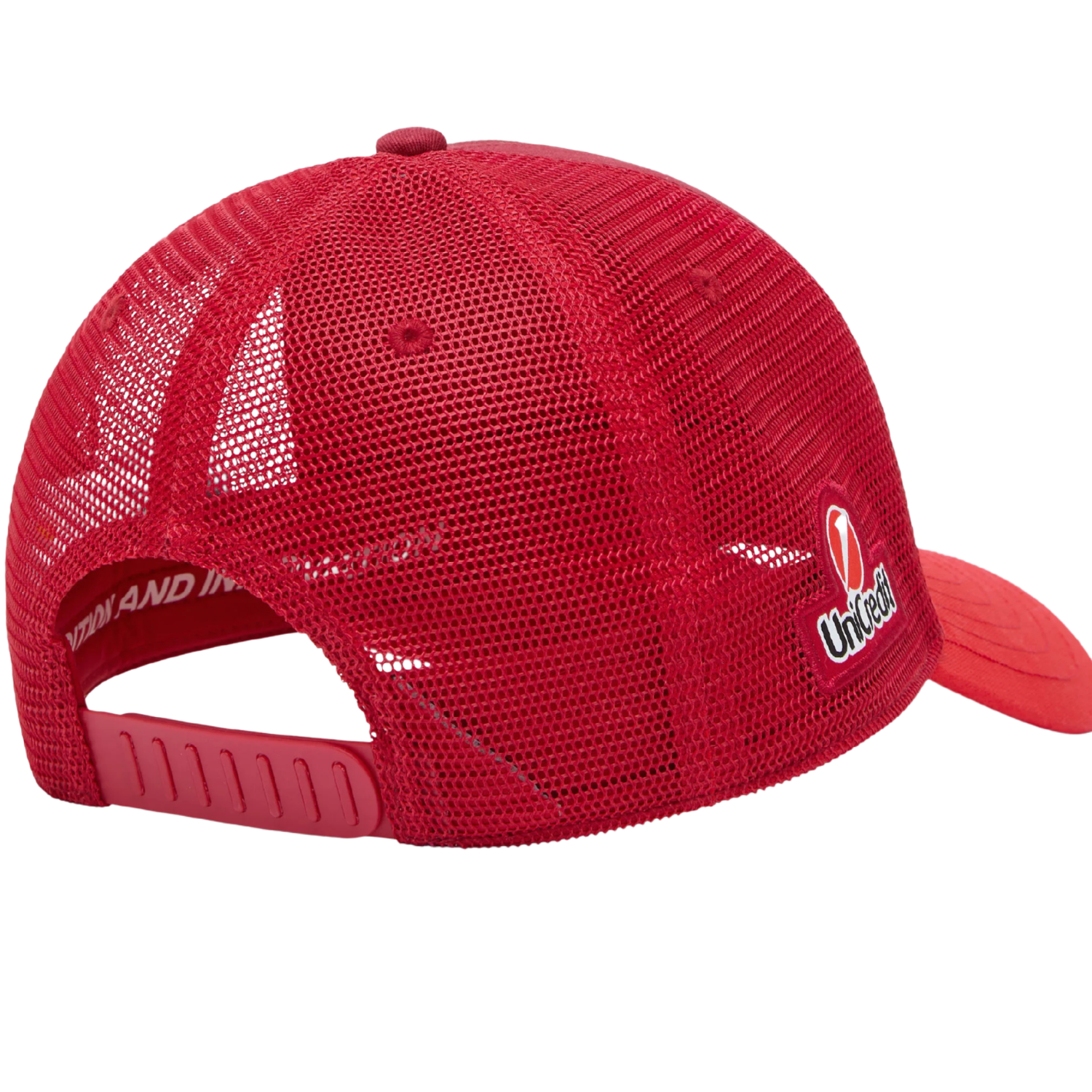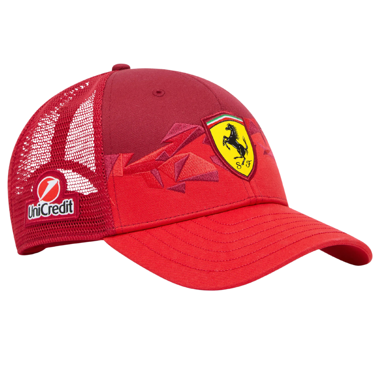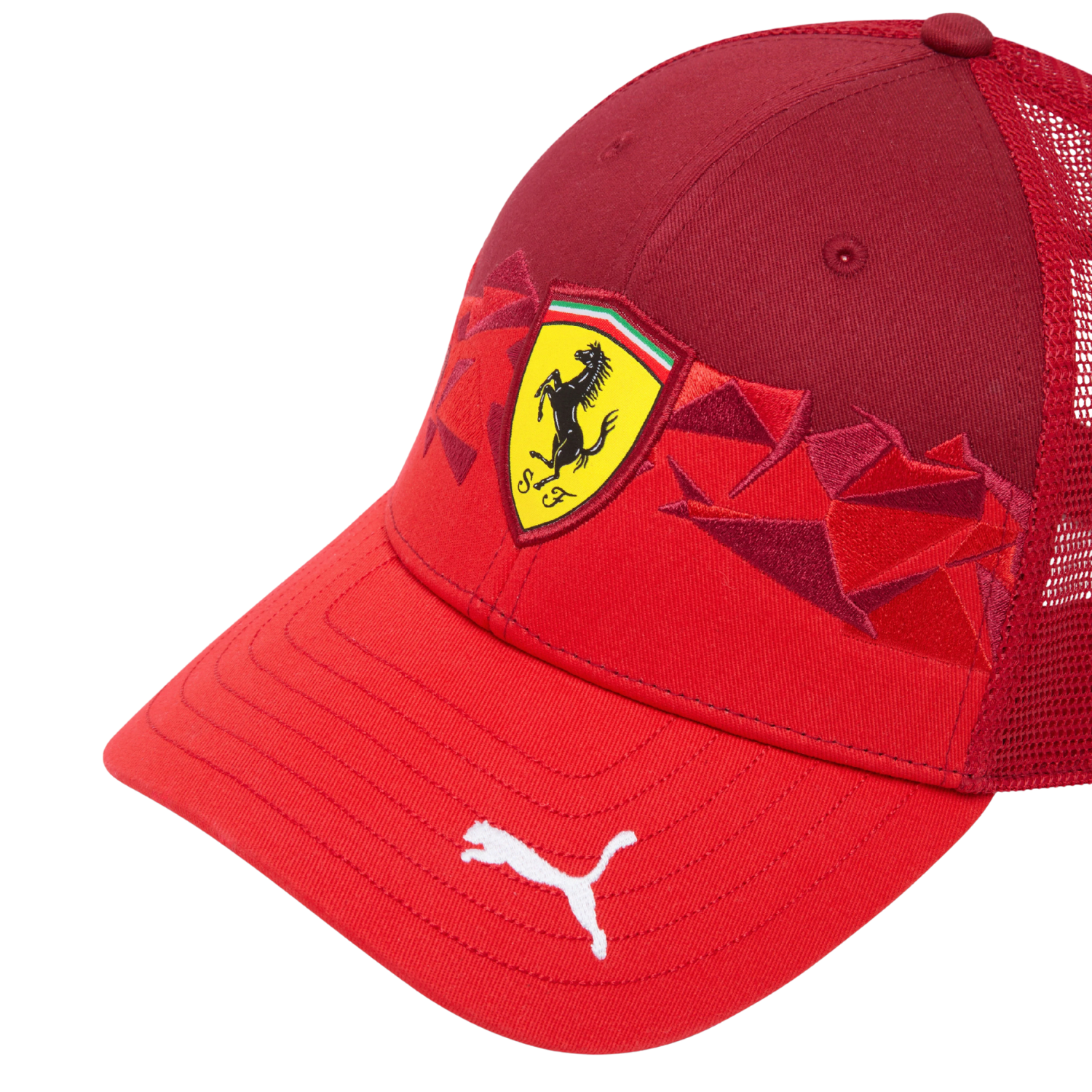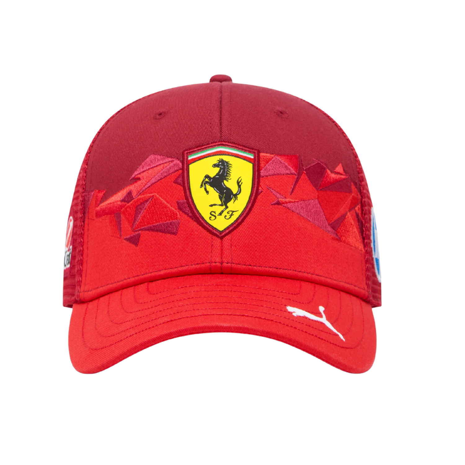 Scuderia Ferrari Las Vegas 2025 Team Cap. Combining racing spirit and urban style, this baseball cap is inspired by the model worn by drivers Charles Leclerc and Lewis Hamilton during the 2025 Las Vegas Grand Prix. Featuring a structured front panel and breathable mesh back, the accessory celebrates 20 years of collaboration between Puma and Scuderia Ferrari HP with a design that reinterprets the iconic shades of red that have defined Ferrari's history, both on and off the track. The front features the Ferrari Scudetto, a symbol of passion and sporting identity.