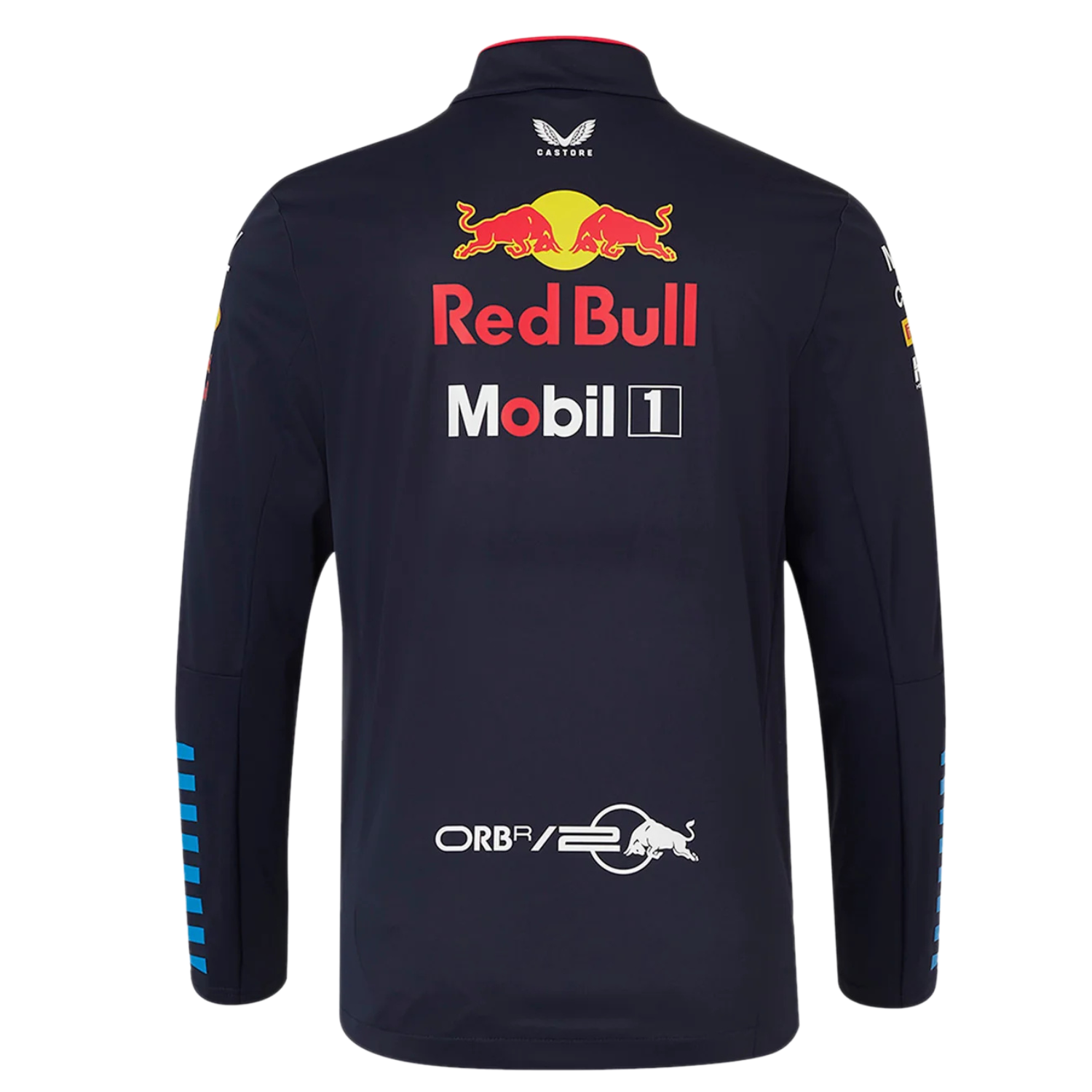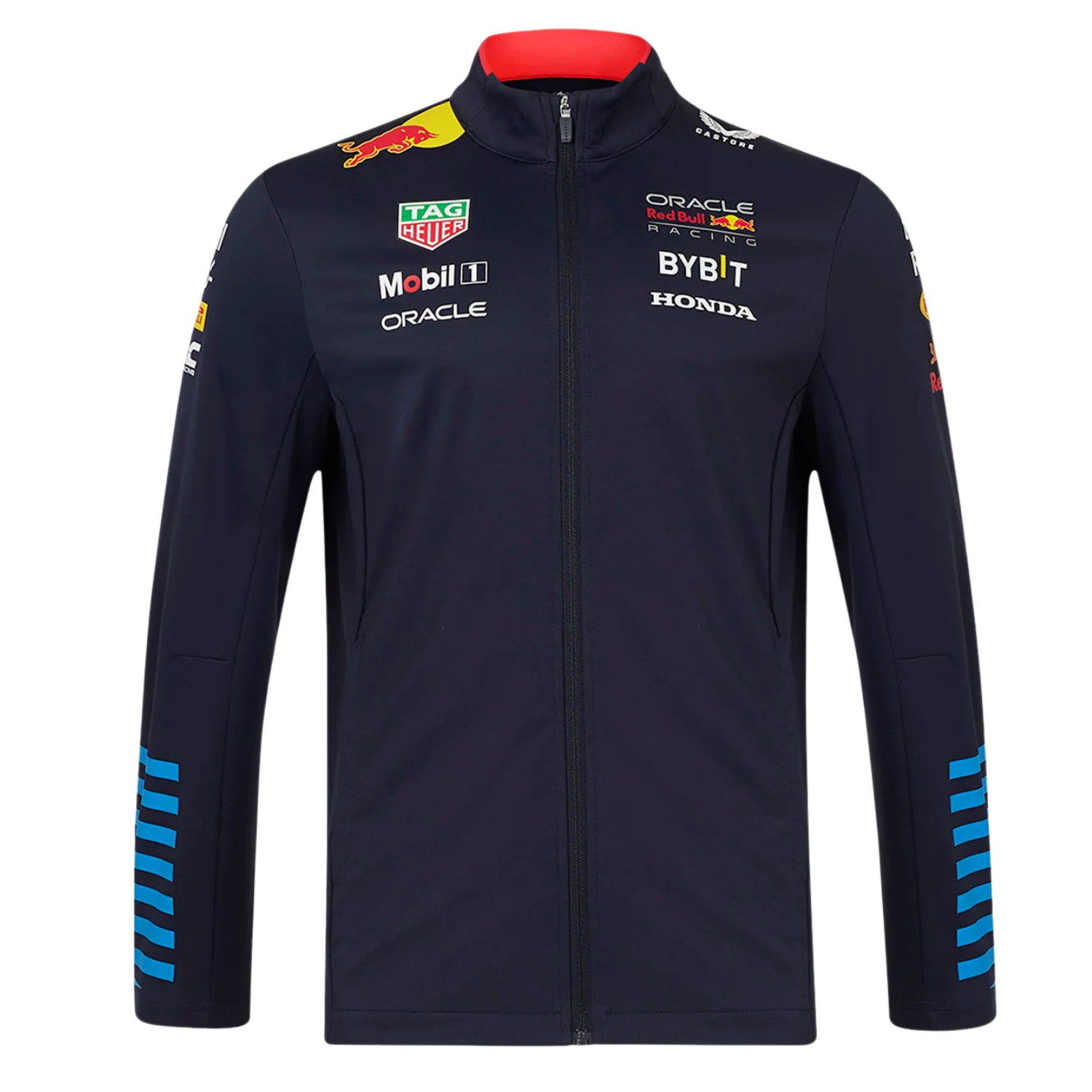 Oracle Red Bull Racing team softshell windbreaker, team and partner logos on the windbreaker. The windbreaker is waterproof and windproof. Breathable, lightweight woven fabric Matte finish with mesh trim. Waterproof up to 3,000 mm. Funnel neckline, hidden side pockets. Screen-printed graphics on the back, branding on the chest, sleeves and back. Material: 100% polyester, manufactured by Castore.
