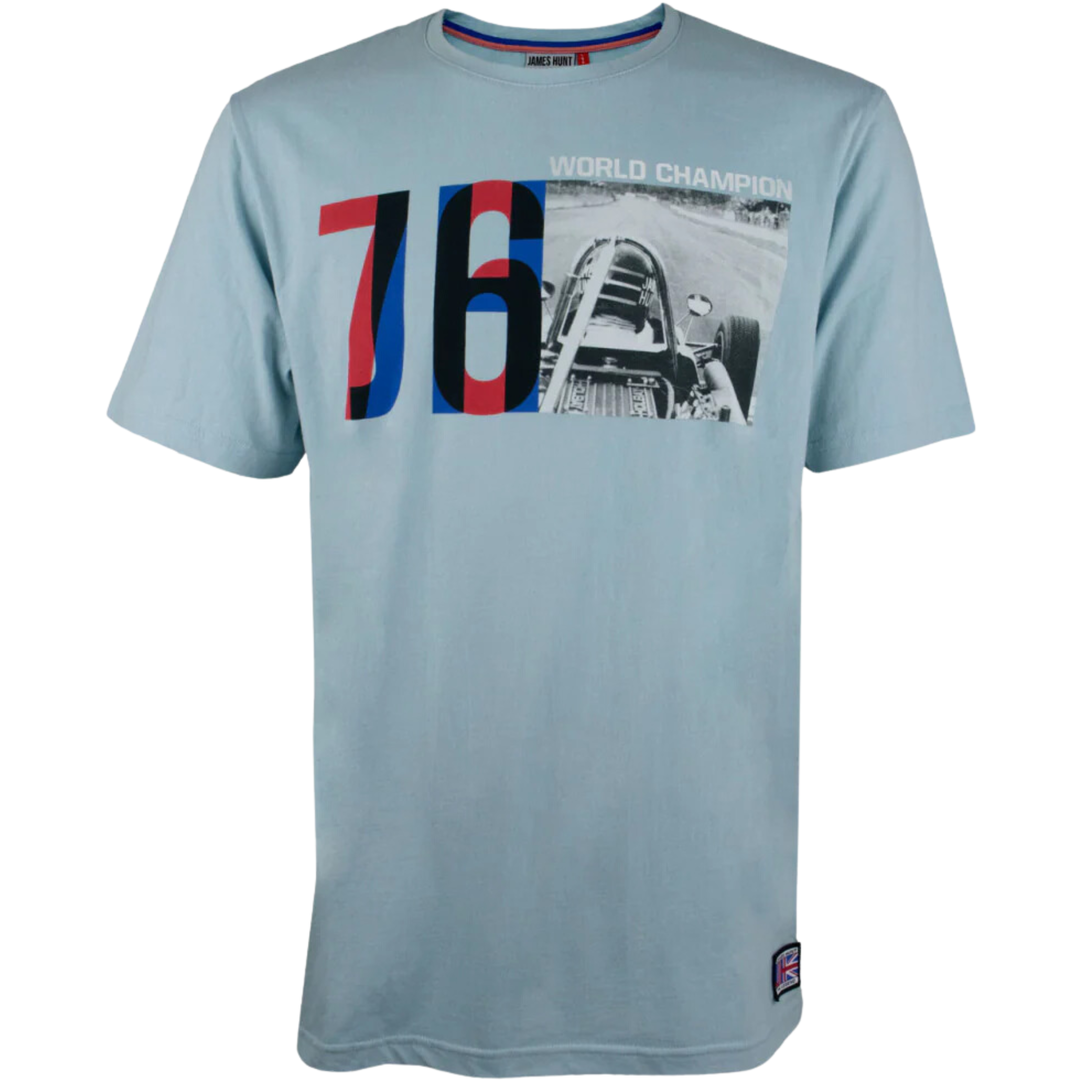 James Hunt T-shirt dedicated to his first title in 1976. Light blue color of the T-shirt with his formula and number 1976. Material 100% cotton.