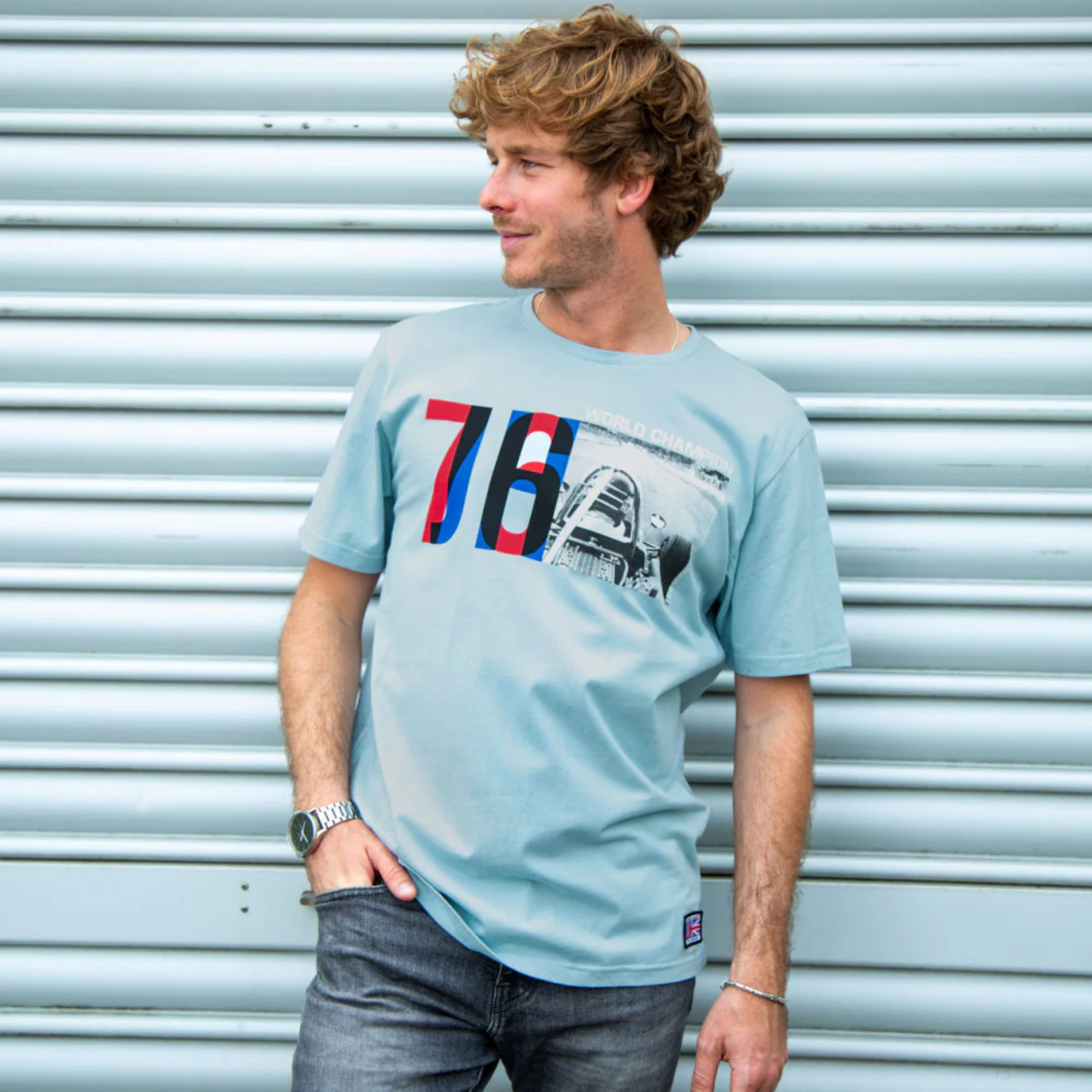 James Hunt T-Shirt, das seinem ersten Titelgewinn im Jahr 1976 gewidmet ist. Hellblaues T-Shirt mit seiner Formel und der Nummer 1976. Material: 100 % Baumwolle.