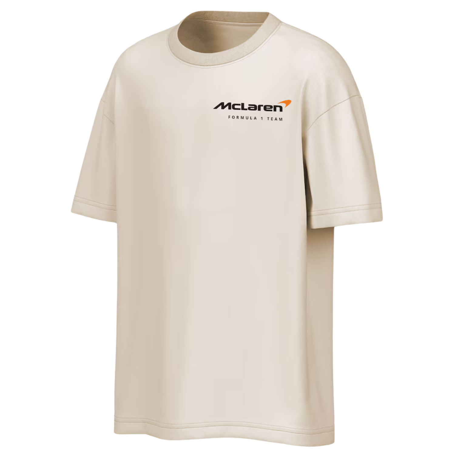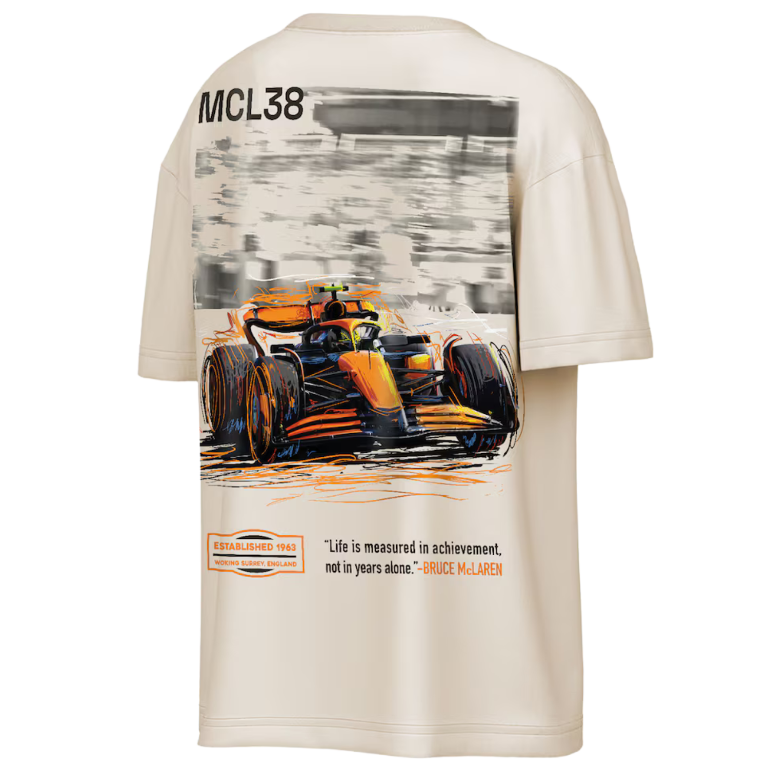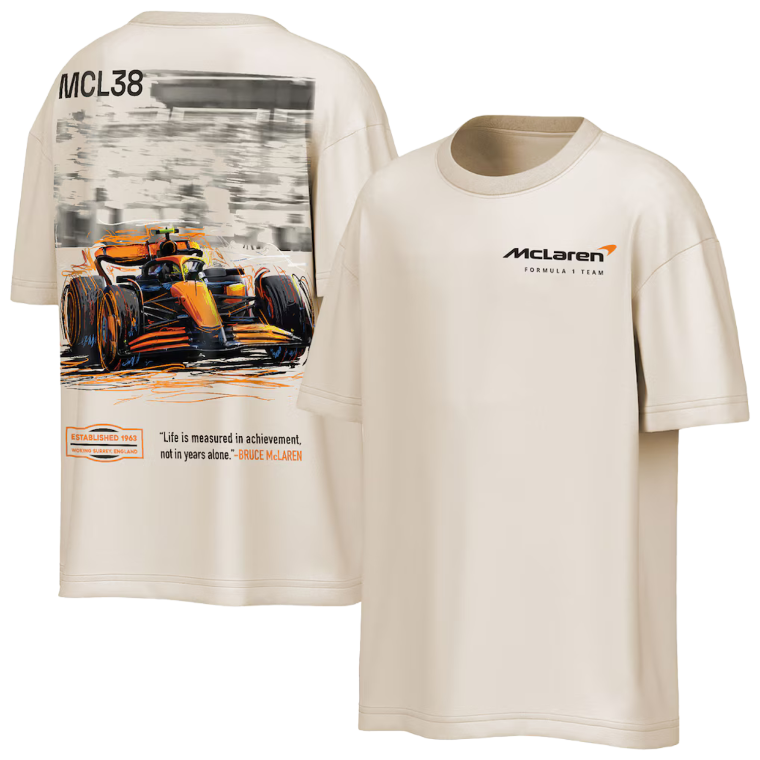 Schweres McLaren-T-Shirt. Das T-Shirt trägt auf der Rückseite das Teamlogo und den McLaren-Schriftzug, das McLaren MCL38-Monopost-Logo und eine Botschaft des Teamgründers: „Das Leben misst sich an Erfolgen, nicht nur an Jahren.“ Material: 100 % Baumwolle.