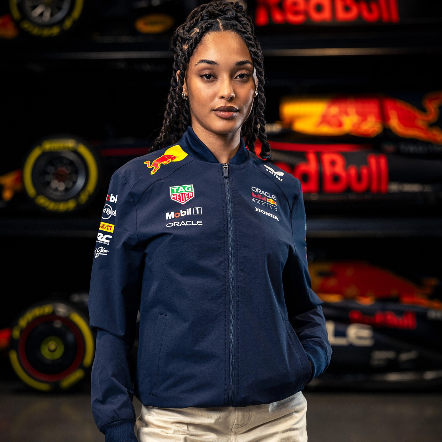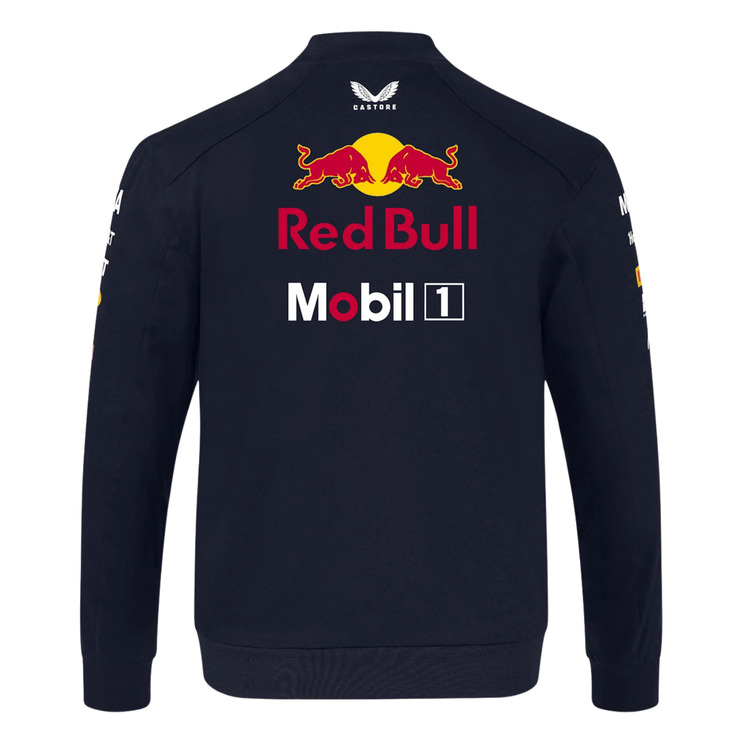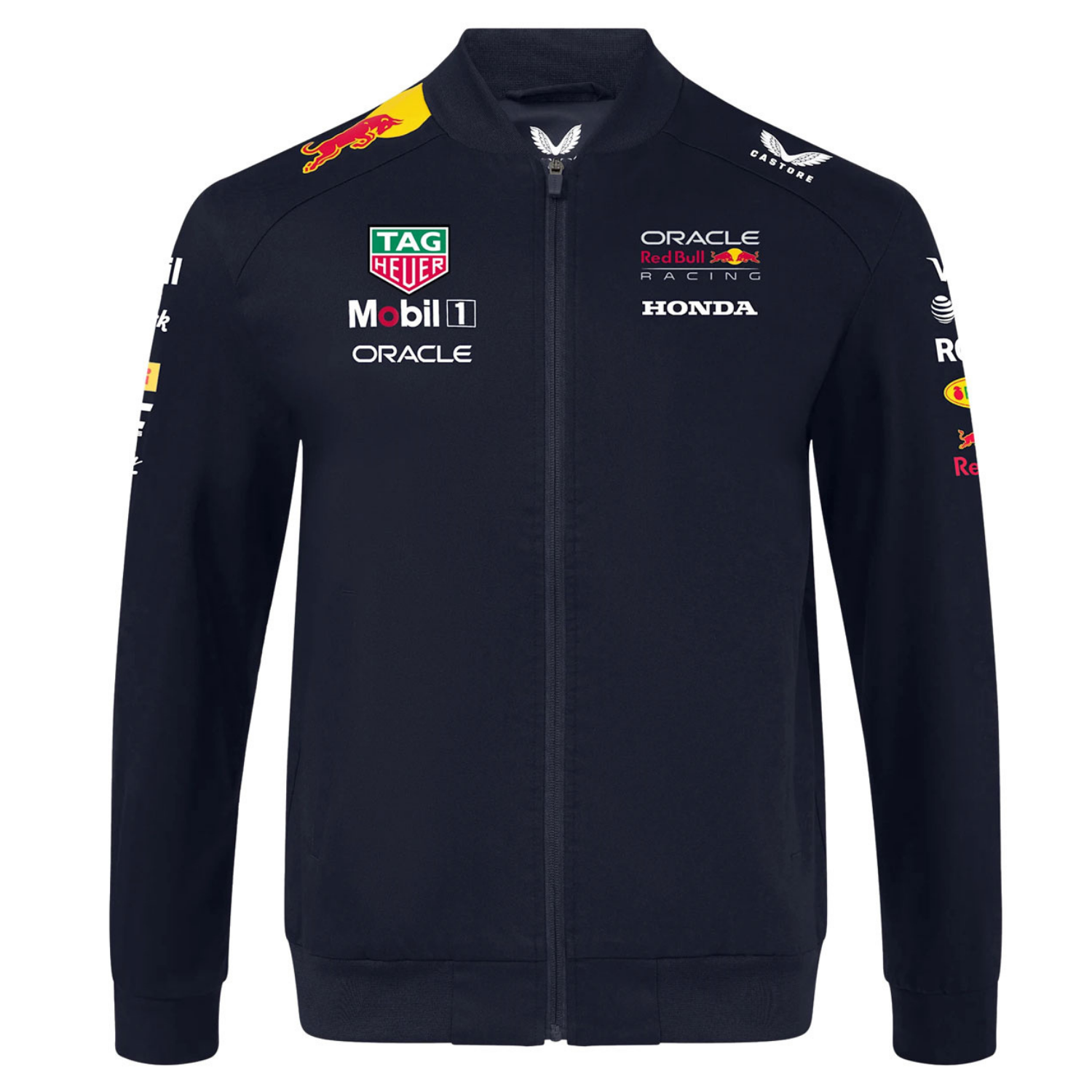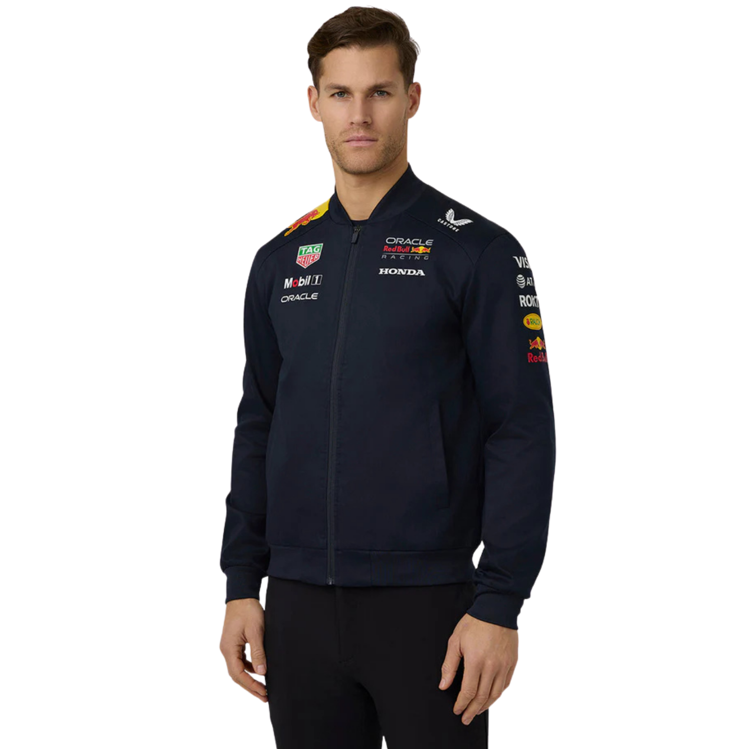Unisex Oracle Red Bull Racing Bomber Jacket. Team and team partner logos on the jacket. Material 70% cotton, 26% polyester, 4% elastane.