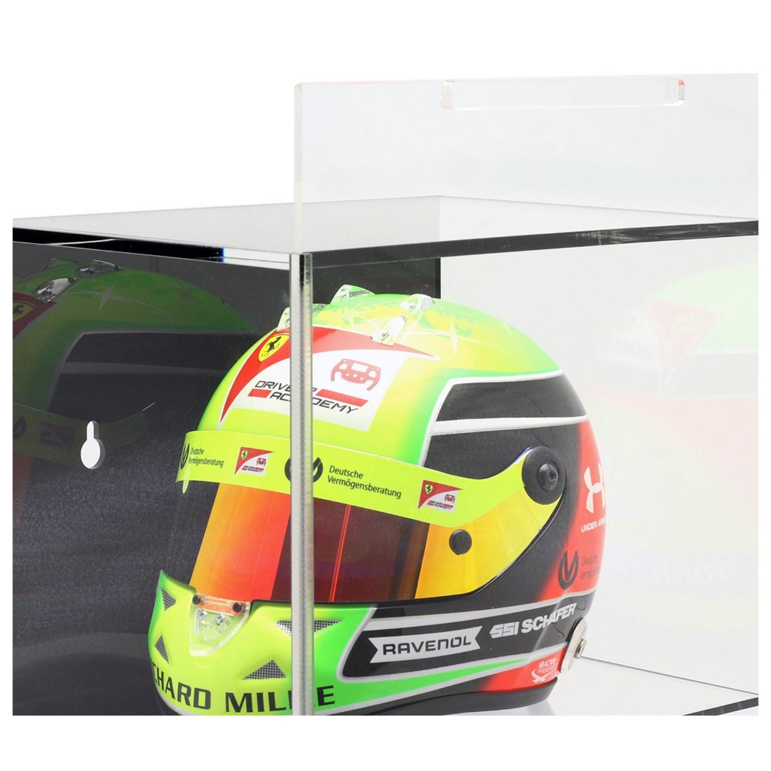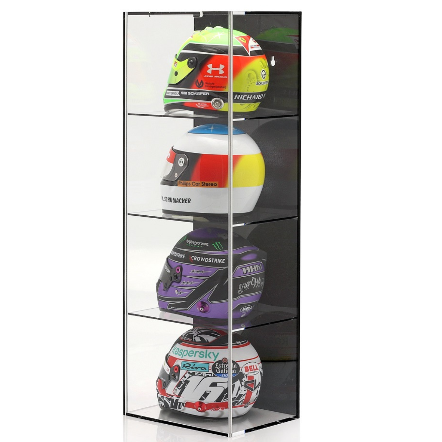 Hochwertige Vitrine für bis zu 4 Helme im Maßstab 1:2. Die Vitrine mit transparentem Deckel und schwarzer Kunststoffrückwand schützt Ihre Sammlerstücke vor Staub und Beschädigungen. Dank der vierteiligen Konstruktion mit einer vollständig ausziehbaren Schublade an der Vorderseite kann die Vitrine sowohl als Standvitrine als auch als Wandvitrine verwendet werden. Die Vitrine wird montiert geliefert und muss nicht selbst zusammengebaut werden. Details: Lieferung mit vorgebohrten Löchern Breite 21 cm Höhe 60,5 cm Tiefe 15,5 cm