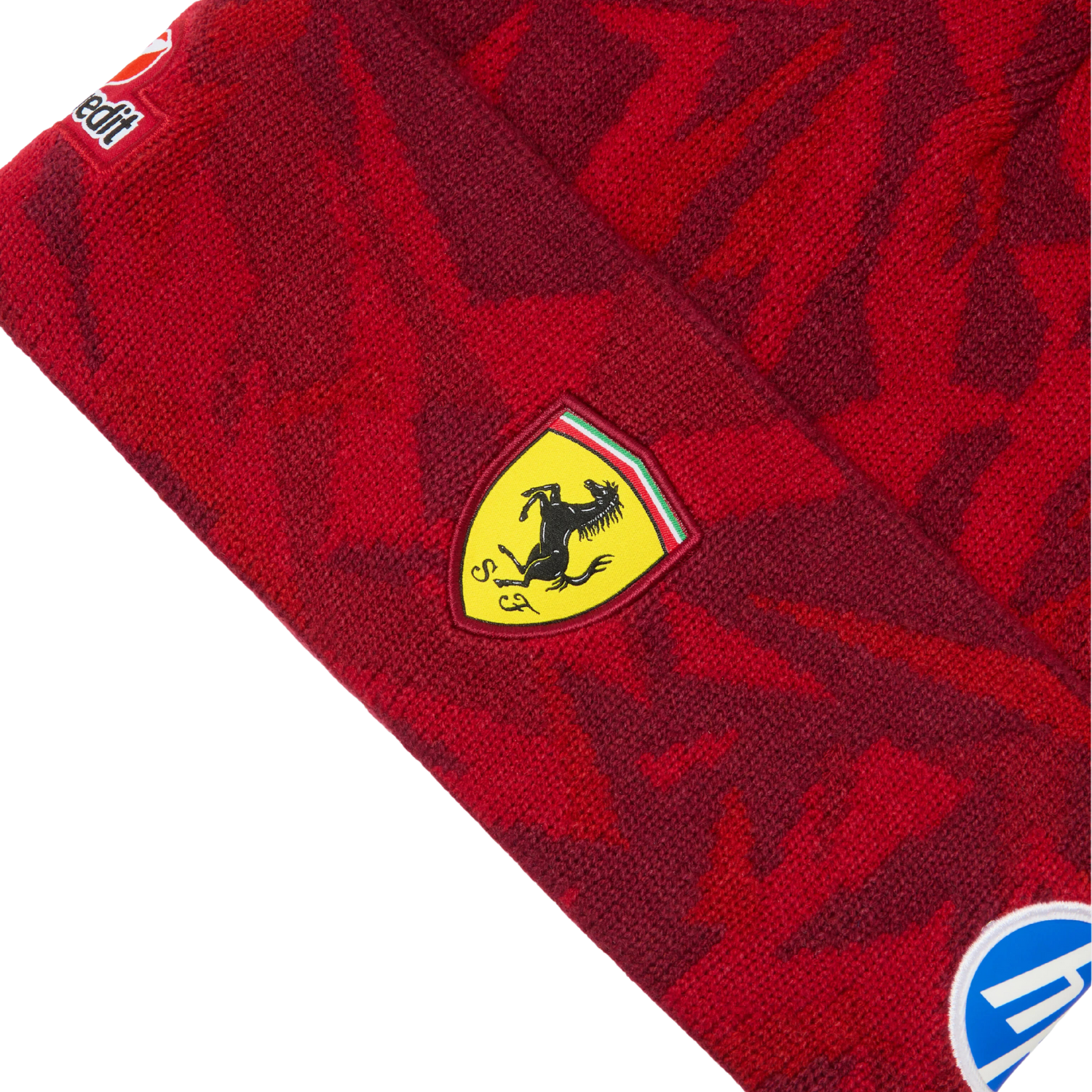 Scuderia Ferrari Las Vegas Special Winter Beanie. Inspired by the energy of the 2025 Las Vegas Grand Prix, this beanie celebrates 20 years of collaboration between Puma and Scuderia Ferrari HP. The high-cuff design features a geometric pattern that reinterprets the iconic shades of red that have marked Ferrari's history, both on and off the track. A matching pom-pom adds a casual, modern touch to complete the look.